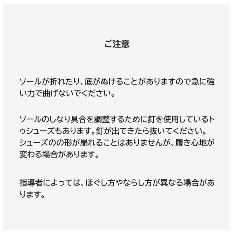 ●製法上、ソール及びインソールは釘が打たれています。弊社にて検品を実施しておりますが、ご使用前に釘が突出していないか確認の上ご使用ください。釘が抜けてもトゥシューズの成形に問題はありませんが、はき心地がかわる場合があります。