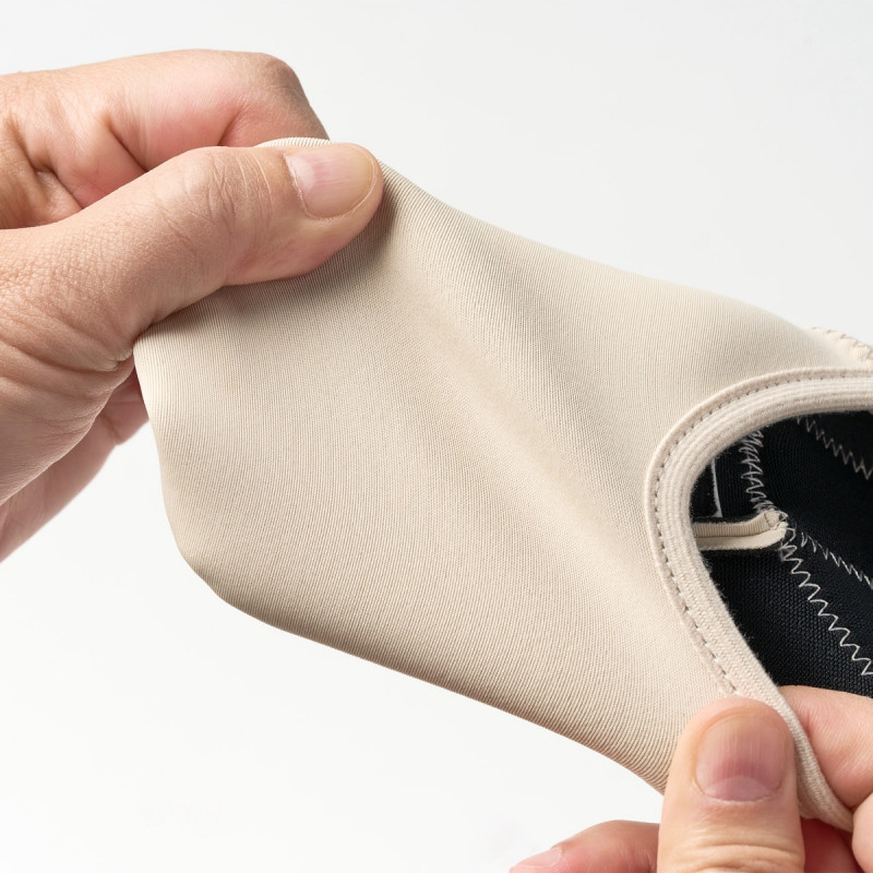 表地2枚+裏地1枚の3層仕立て。伸縮性のある生地とクッション材(ウレタン)を組み合わせ、足にやさしくフィットしながらシワの出ない美しいラインを叶えました。