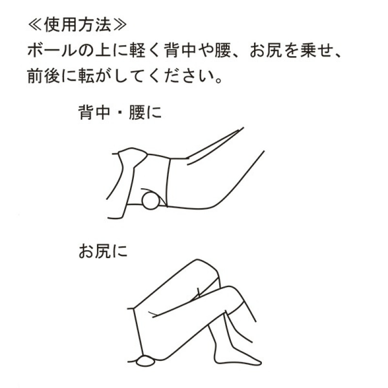 【使用方法】ボールの上に軽く背中や腰、お尻などを乗せ、前後に転がしてください。