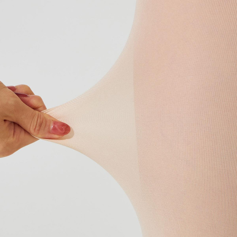 生地のつっぱりは穴の開きやすさにもつながってしまうため、股下にはクロッチ仕様を採用。レオタードの脚ぐりから見えないよう、調整しています。大きく伸び縮みするクロッチ周りは、編立方法を変えることで伝線しにくい仕様に。