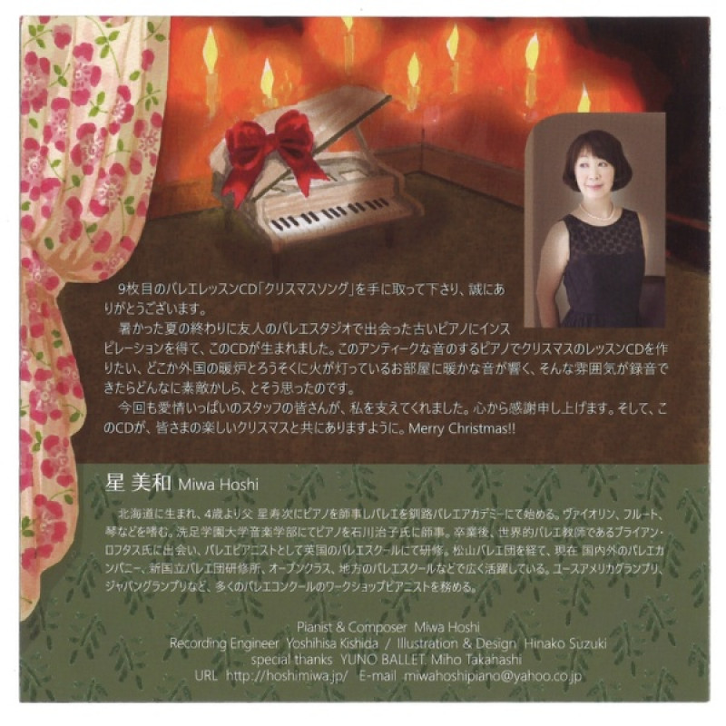 ●〜星美和さんより〜 暑かった夏の終わりに友人のバレエスタジオで出会った古いピアノにインスピレーションを得て、このCDが生まれました。 このアンティークな音のするピアノでクリスマスのレッスンCDを作りたい、どこか外国の暖炉とろうそくに火が灯っているお部屋に暖かな音が響く、そんな雰囲気が録音できたらどんなに素敵かしら、とそう思ったのです。 このCDが、皆さまの楽しいクリスマスと共にありますように。Merry Christmas!!
