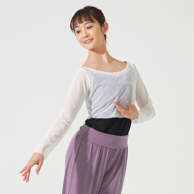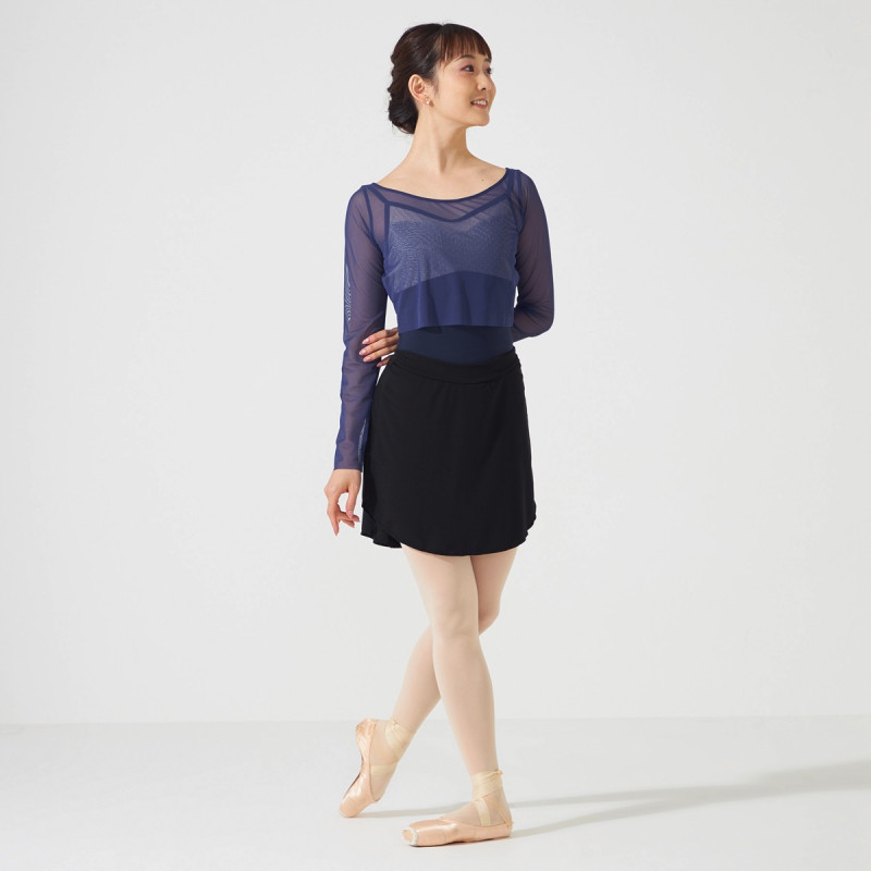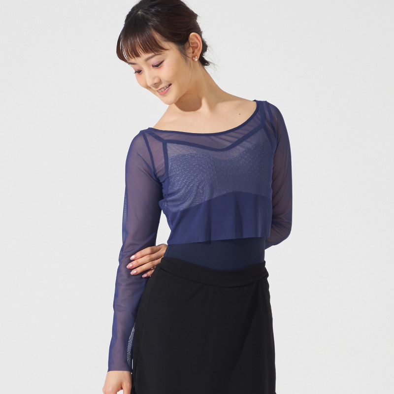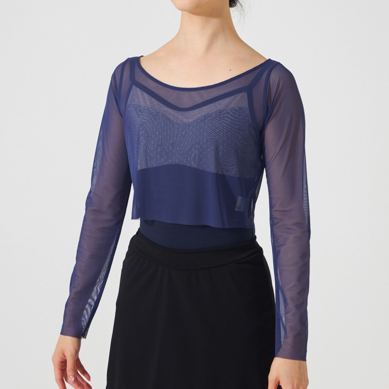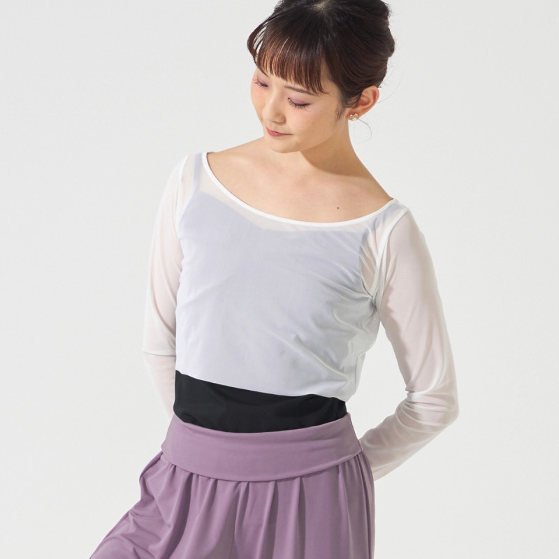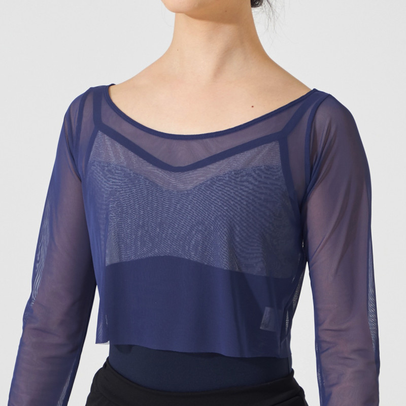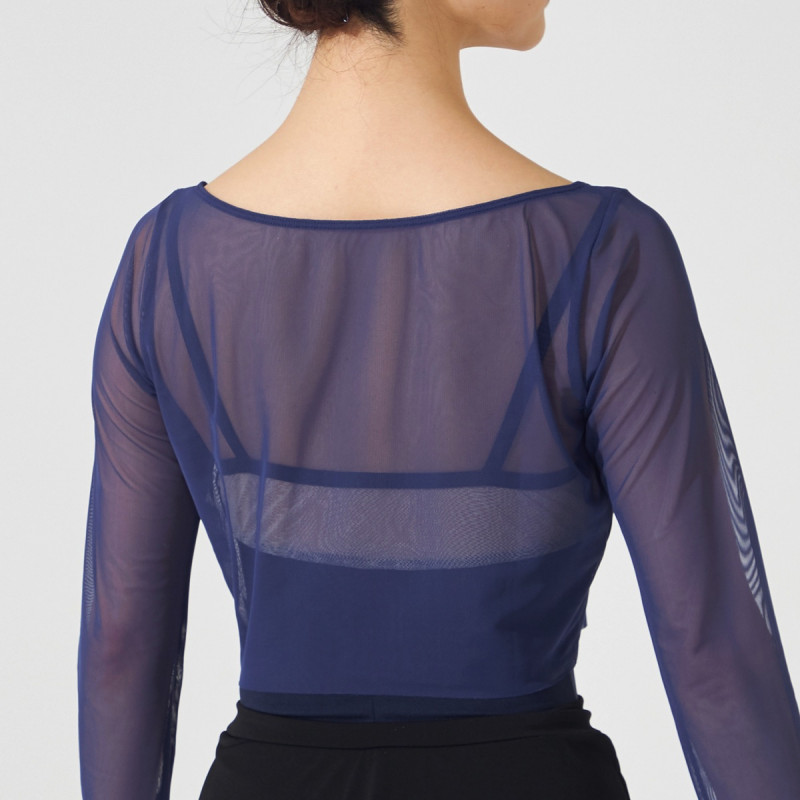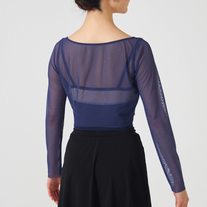 広めに開いた衿ぐりが首回りをきれいに見せるチュール素材のショート丈トップ