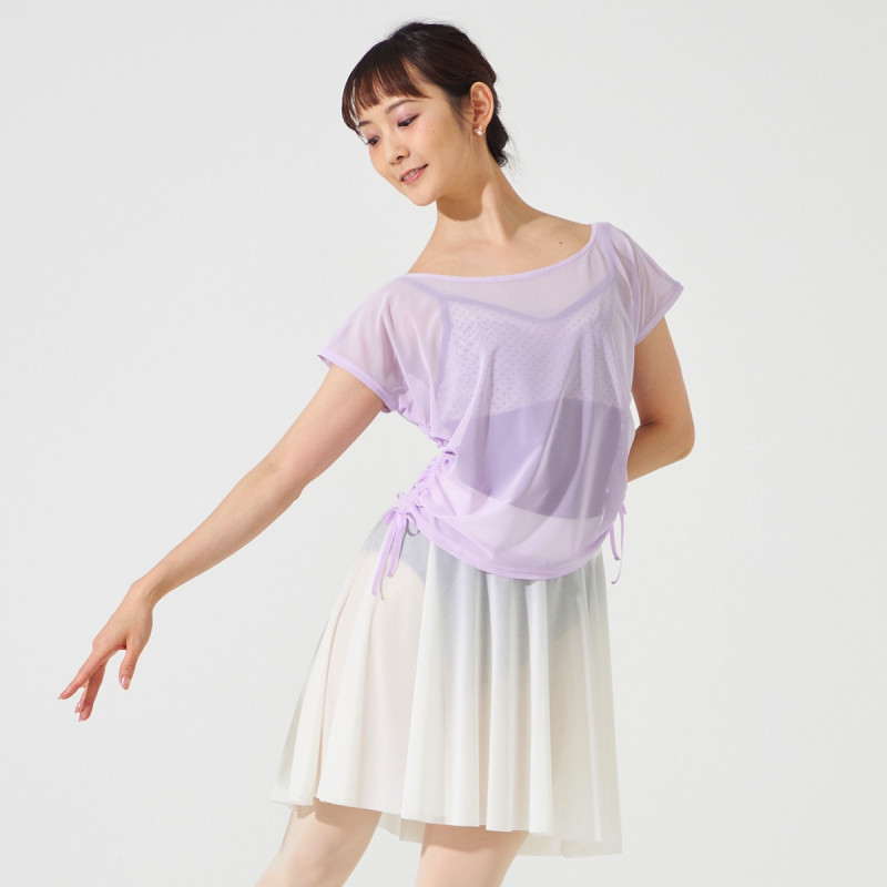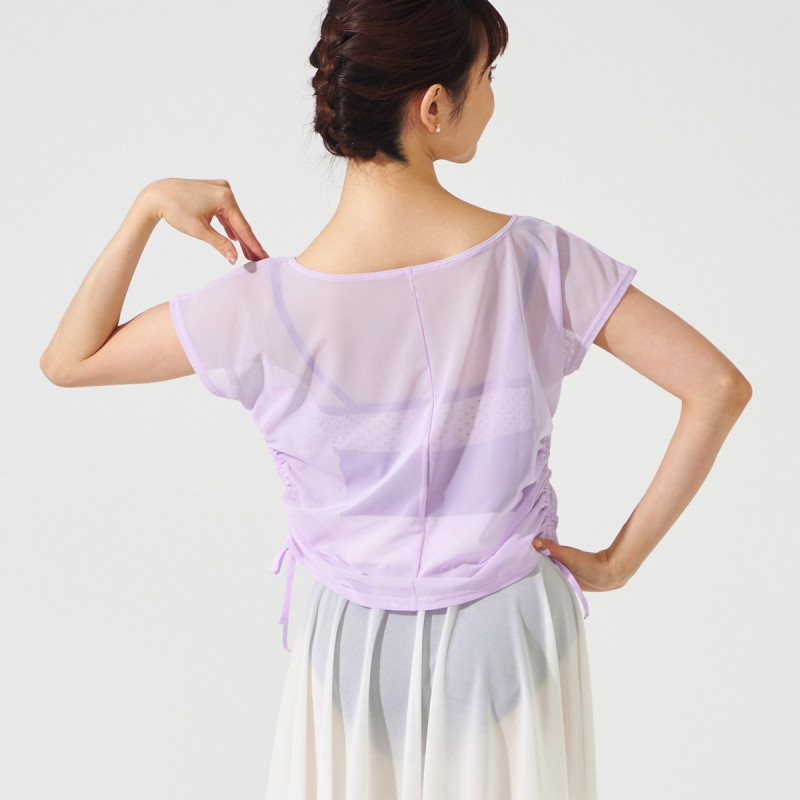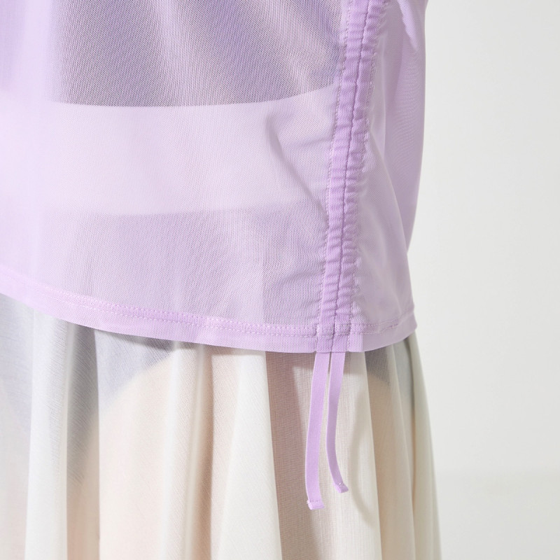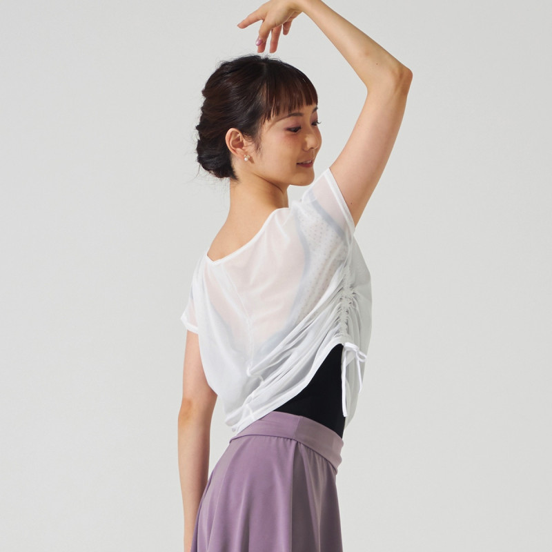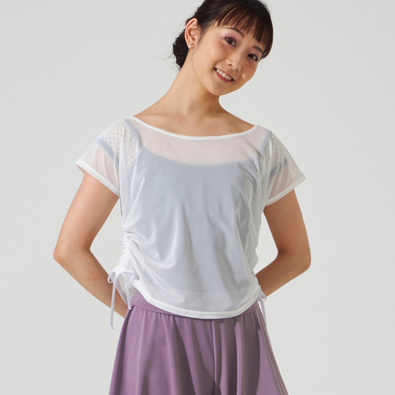 両サイドにドローストリングを入れたコーディネートや体型に合わせて着丈アレンジが楽しめるデザイントップ