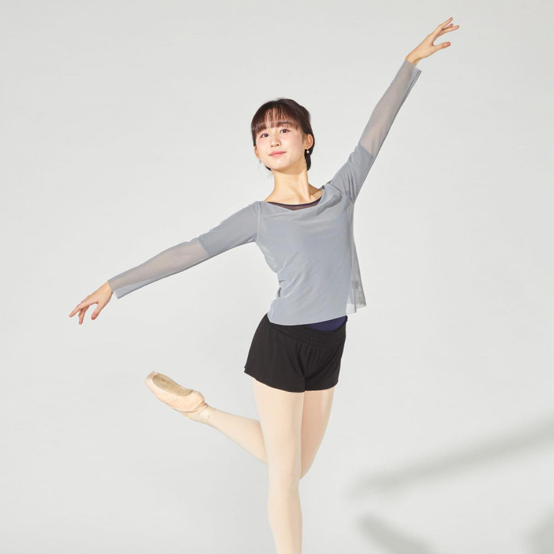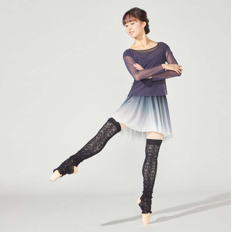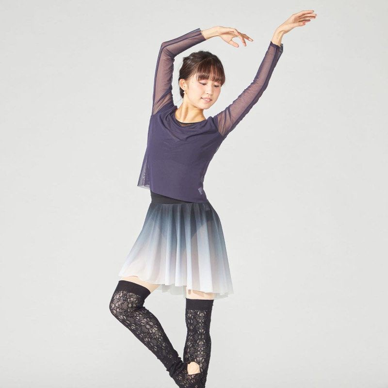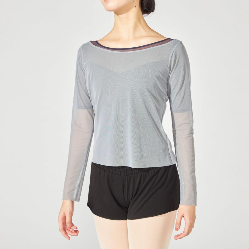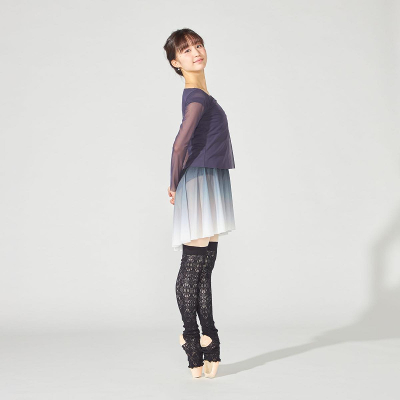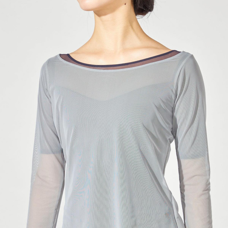 広めに開いた衿ぐりが首回りを綺麗に見せるチュール素材のフルレングストップ