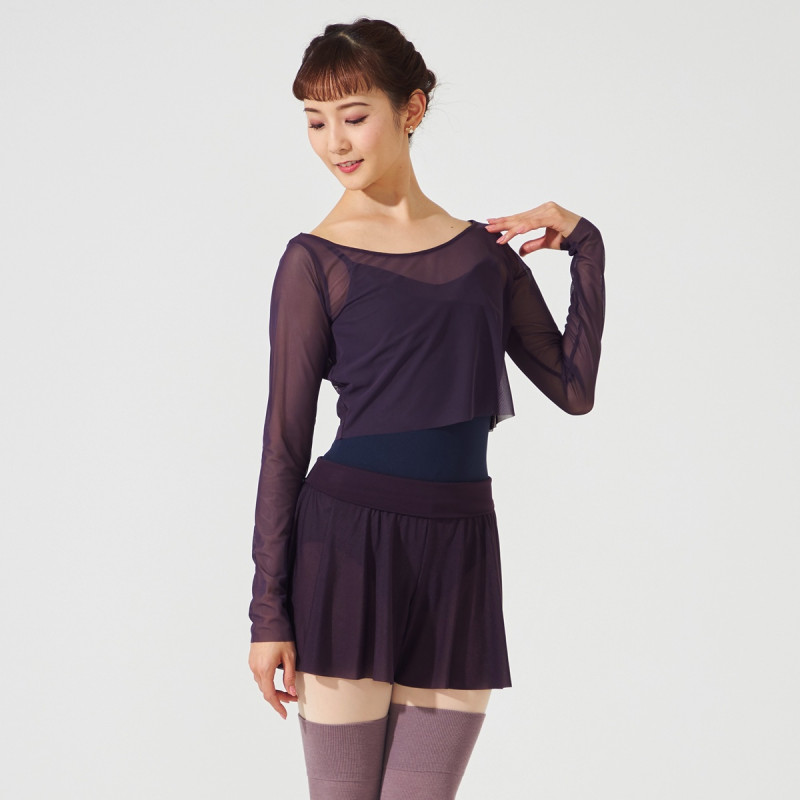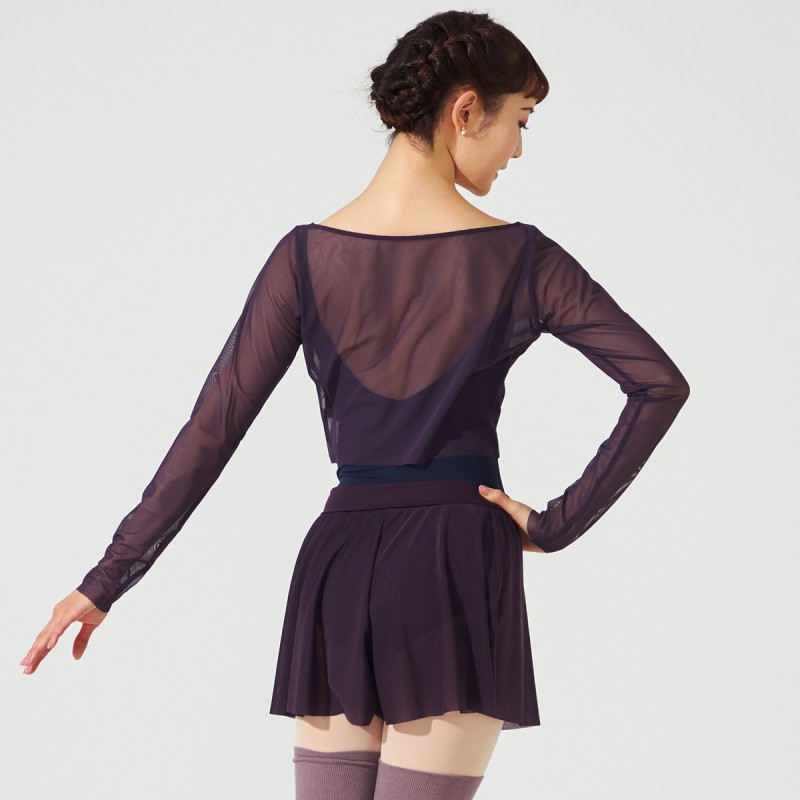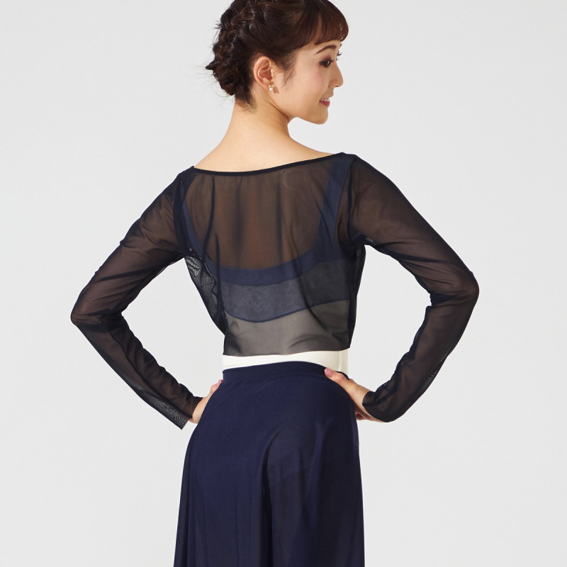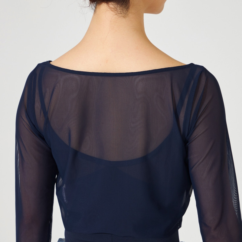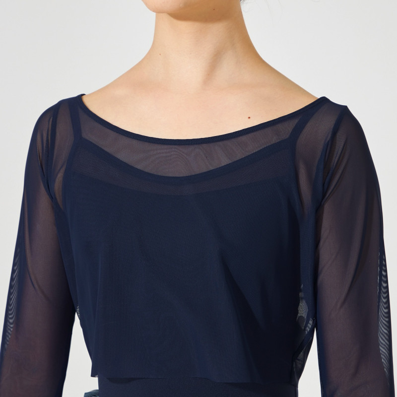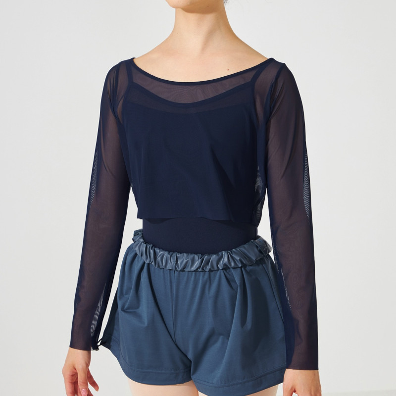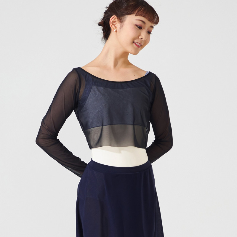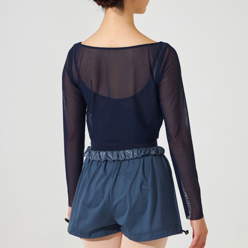 広めに開いた衿ぐりが首回りをきれいに見せるチュール素材のショート丈トップ
