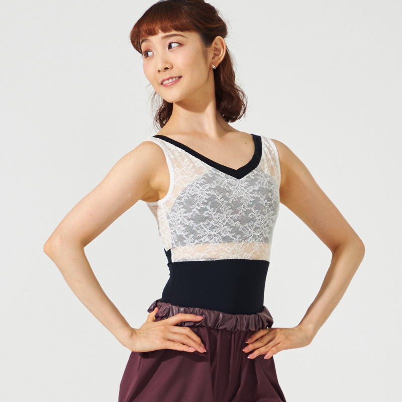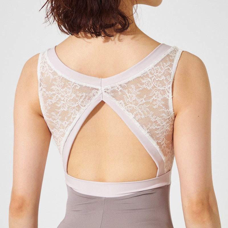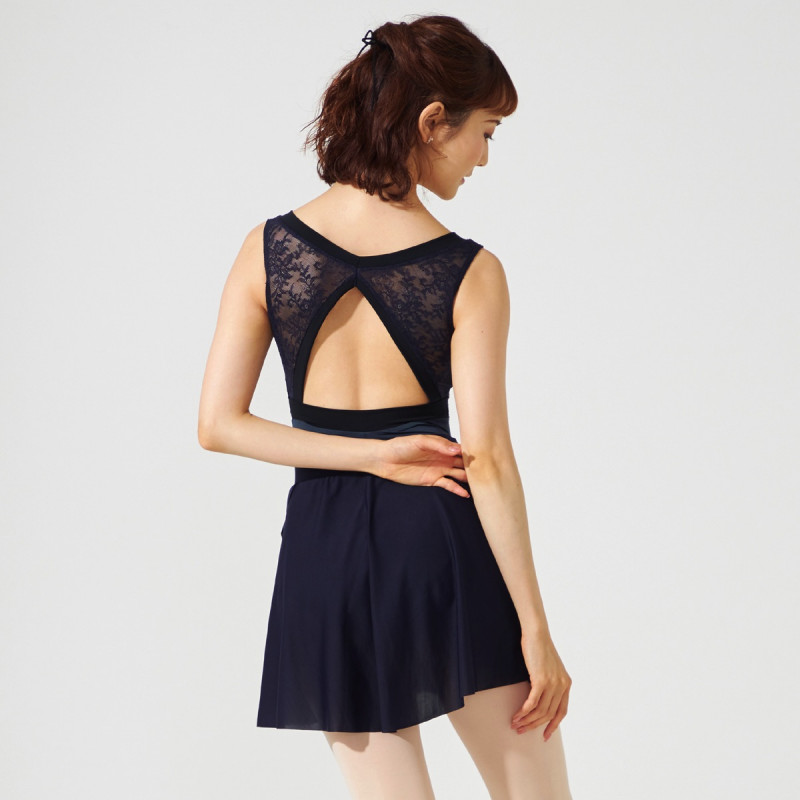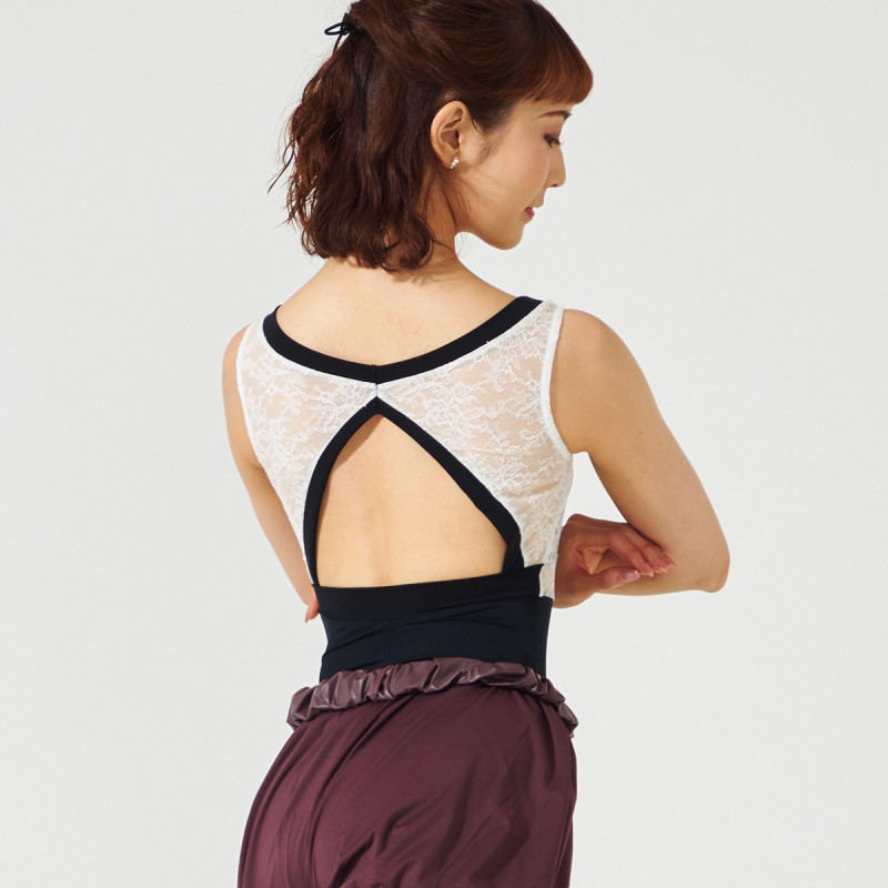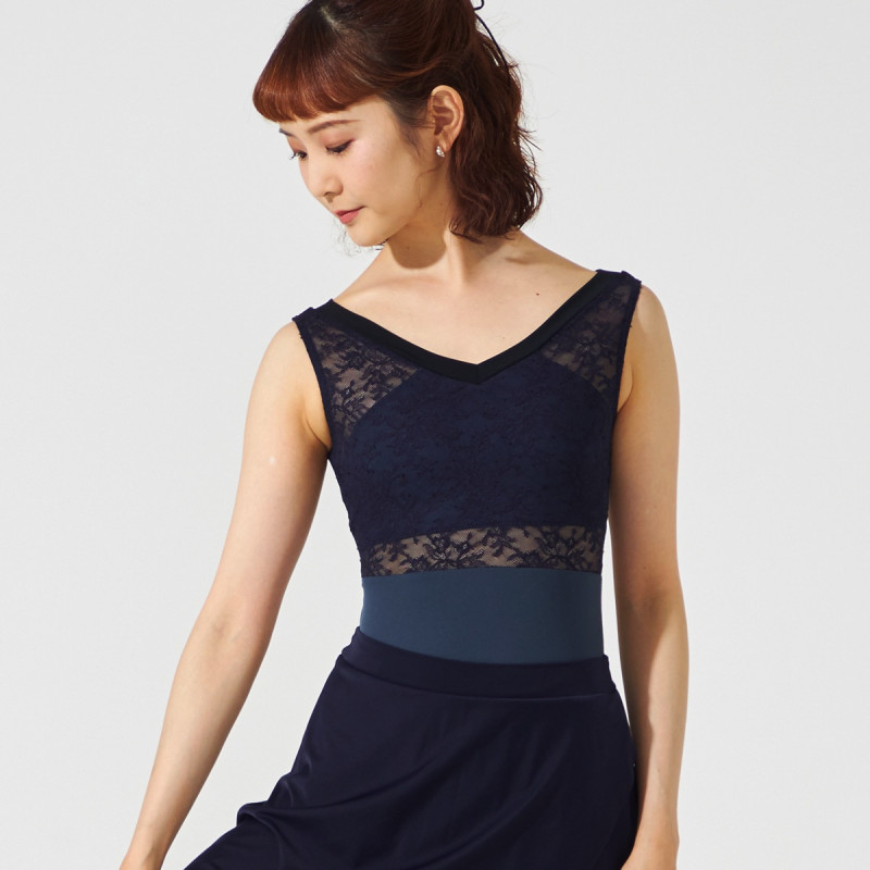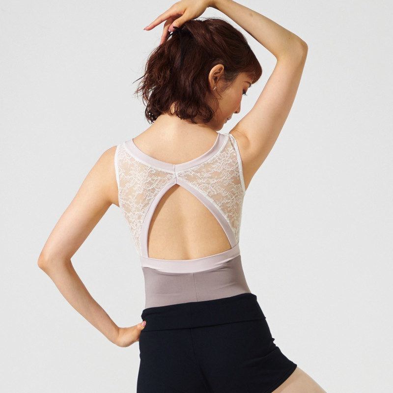 衿ぐりの太い切り替えやお腹の透け感がモダンな印象のノースリーブレオタード