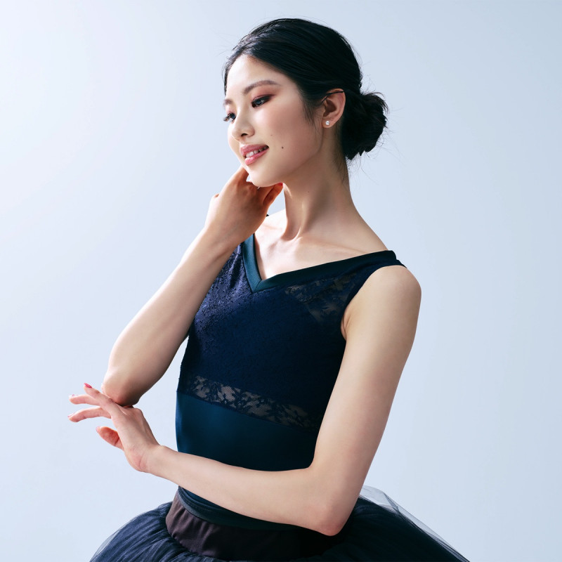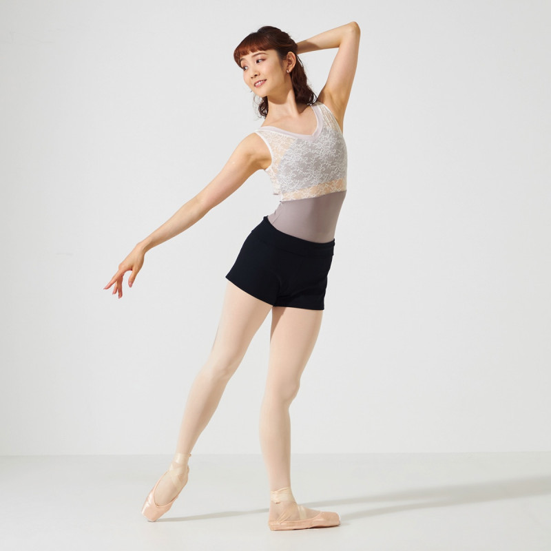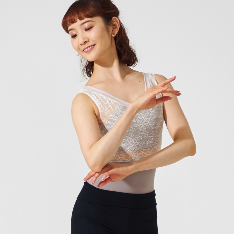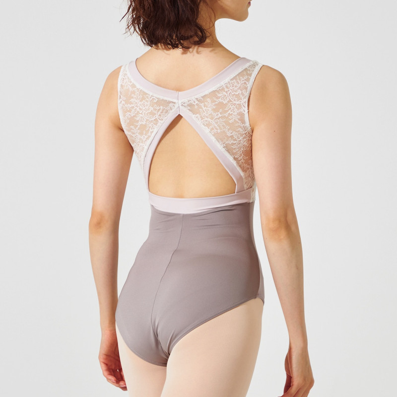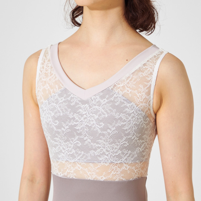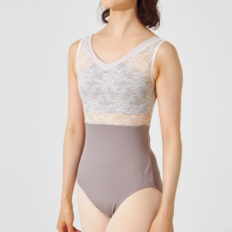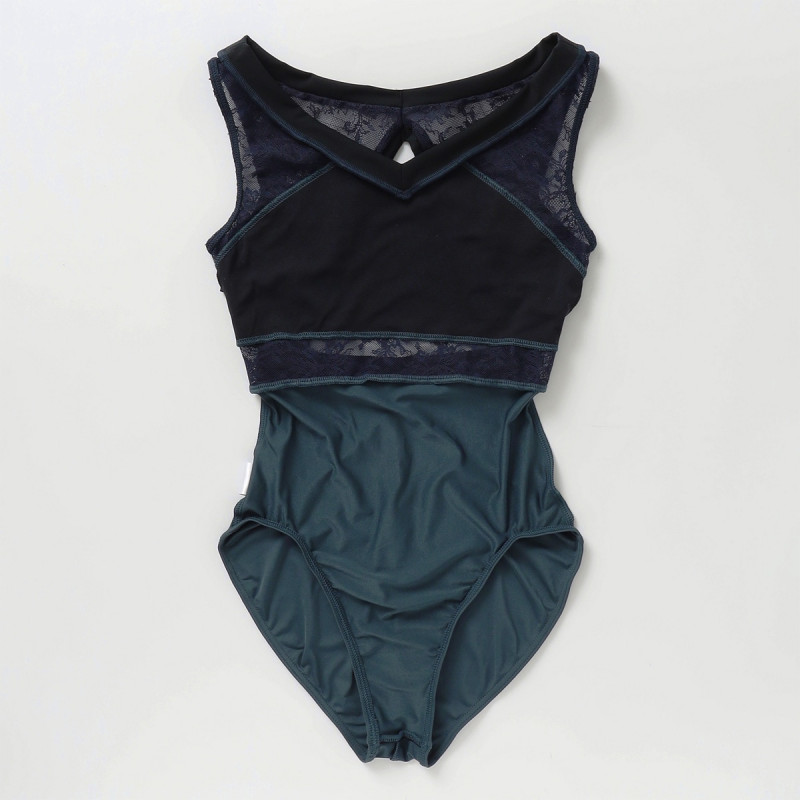 衿ぐりの太い切り替えやお腹の透け感がモダンな印象のノースリーブレオタード