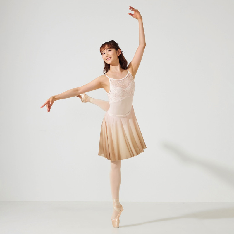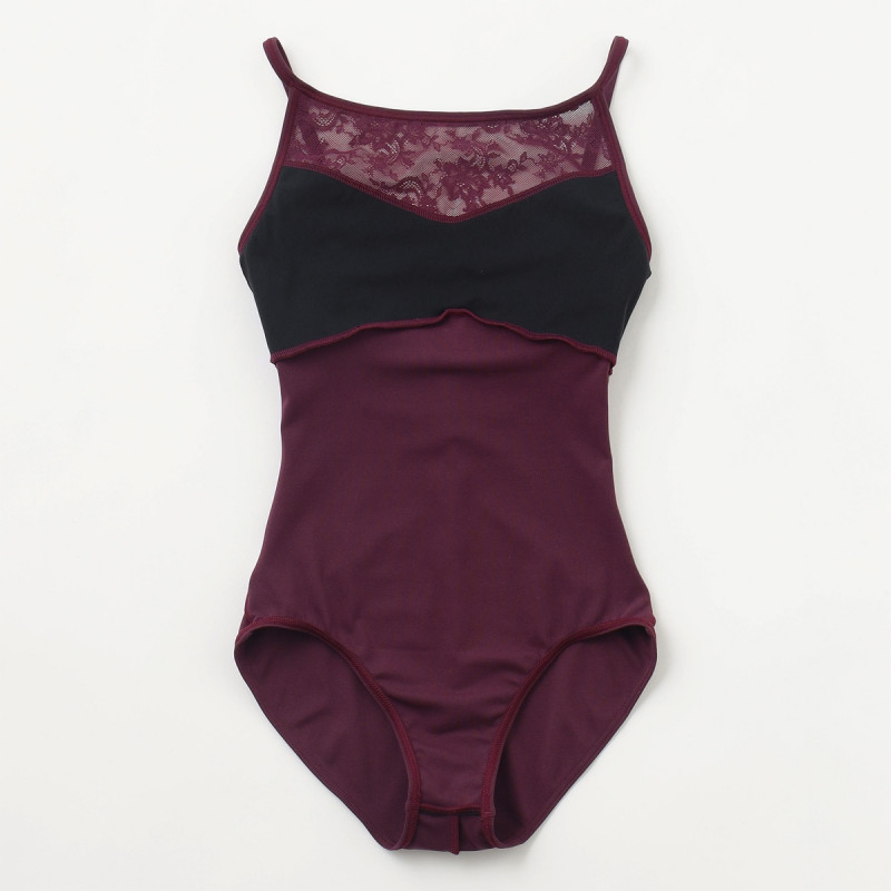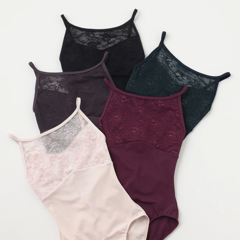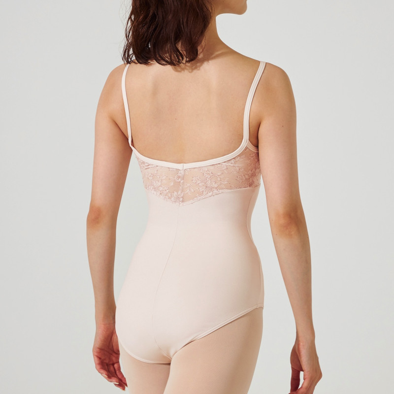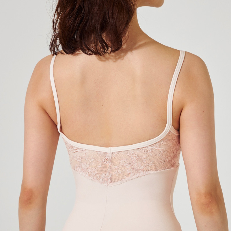 衿ぐりから肩に繋がるストラップラインがデコルテを広く見せるキャミソールレオタード