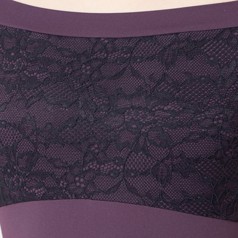 生地の伸縮性を利用した衿ぐりの切り替えは吸い付くようなフィット感があり、レースの肌当たりが気になりにくい優しい着心地。