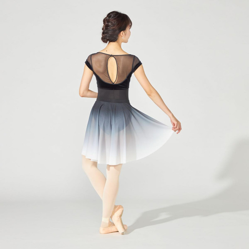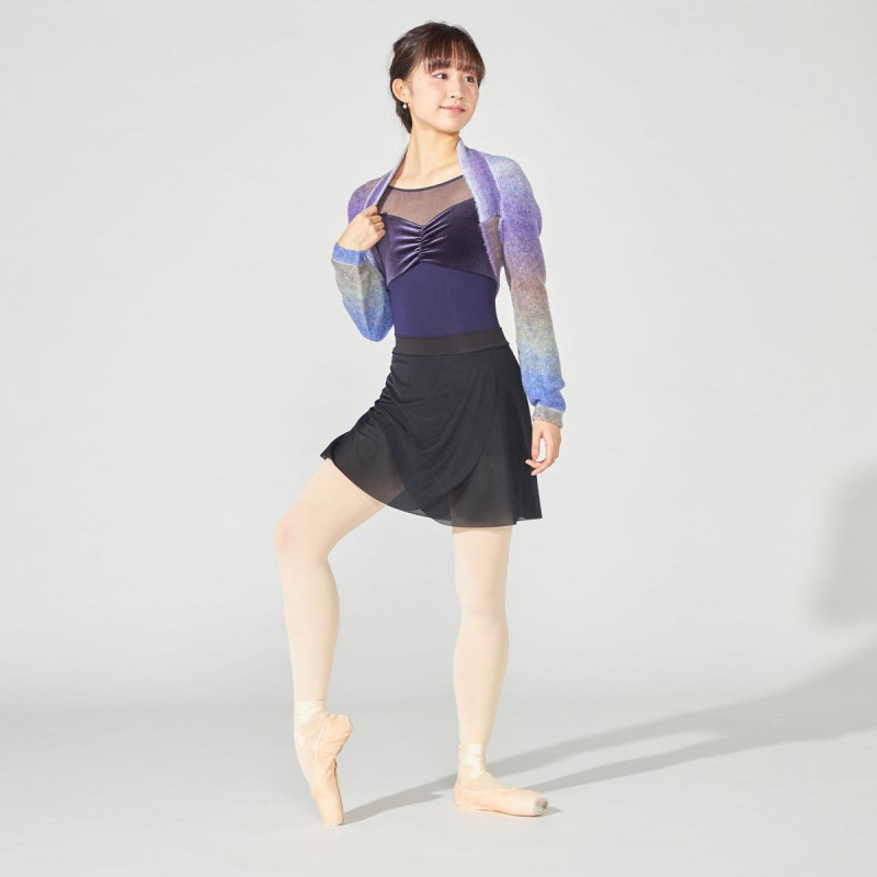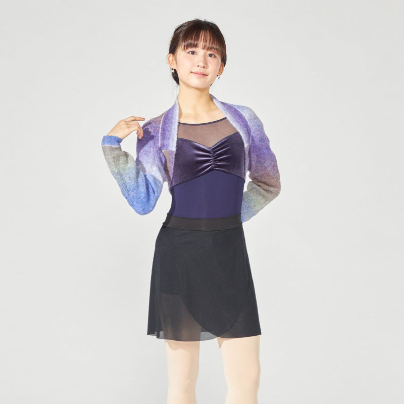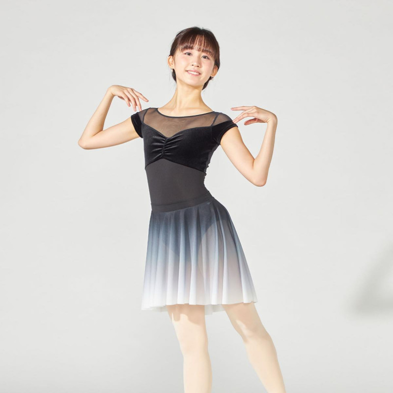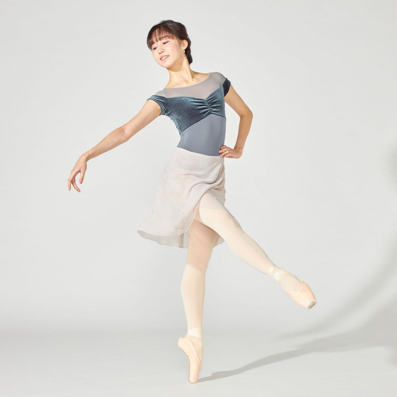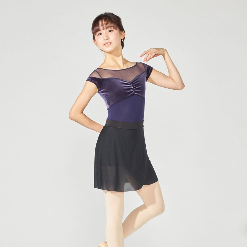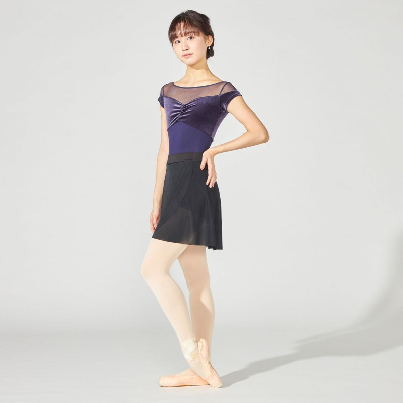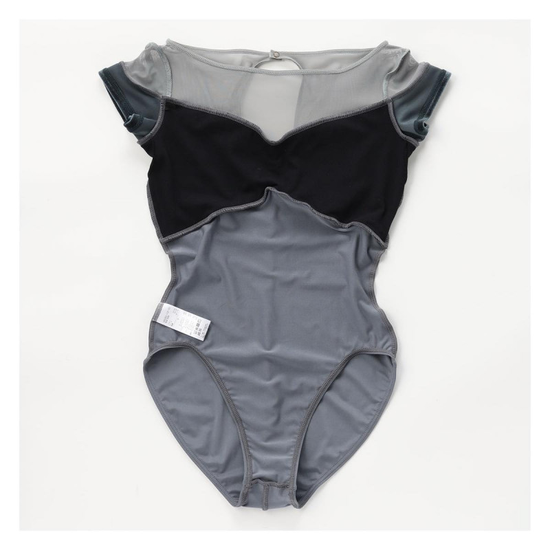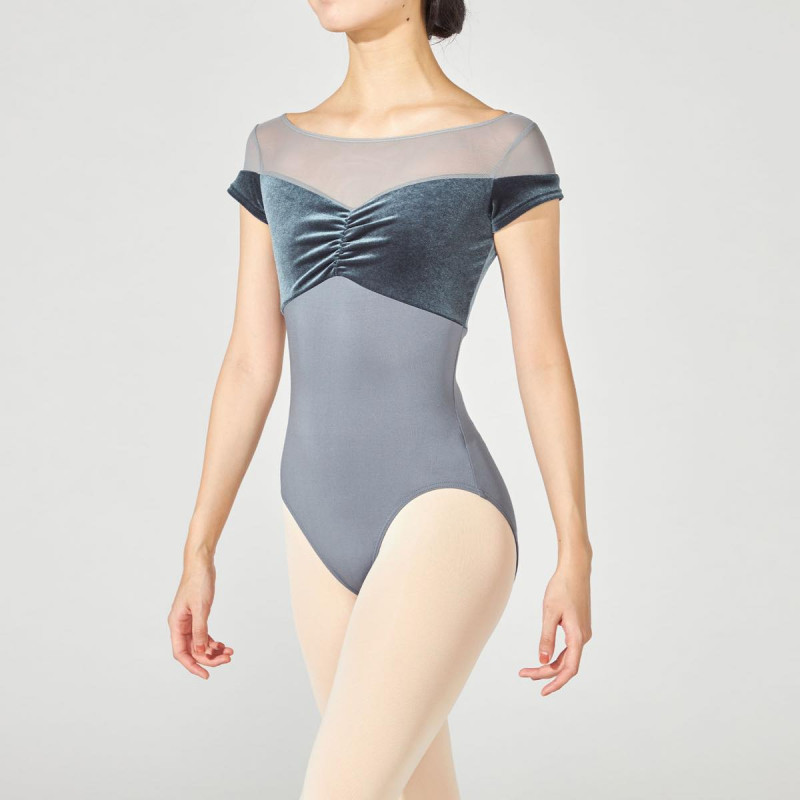 胸元から袖にかけてストレッチベロアを切り替えた、オフショルダー風のハーフスリーブレオタード