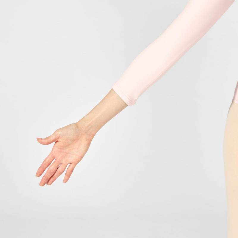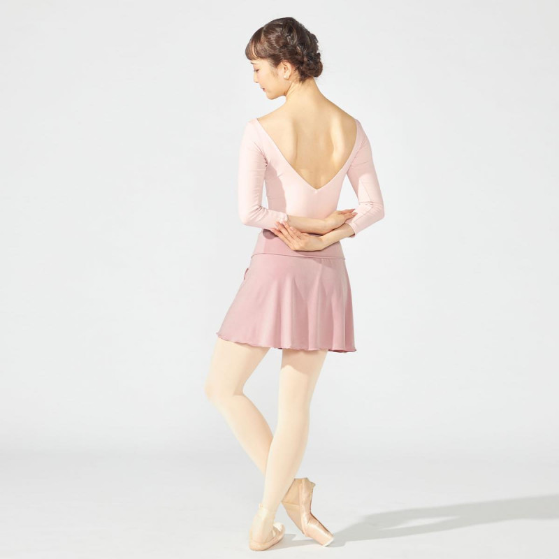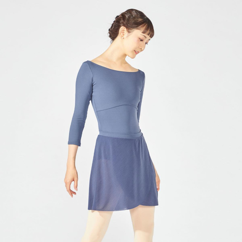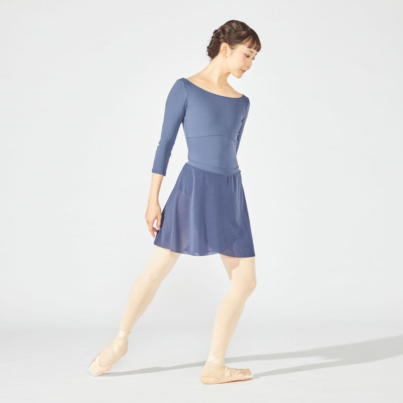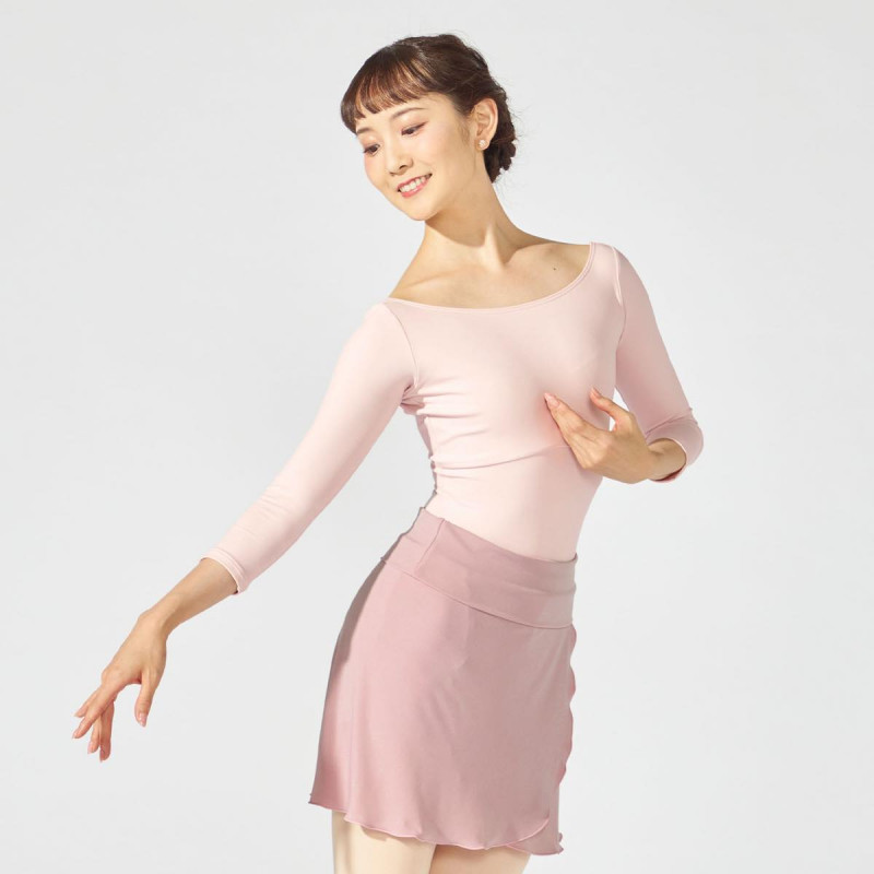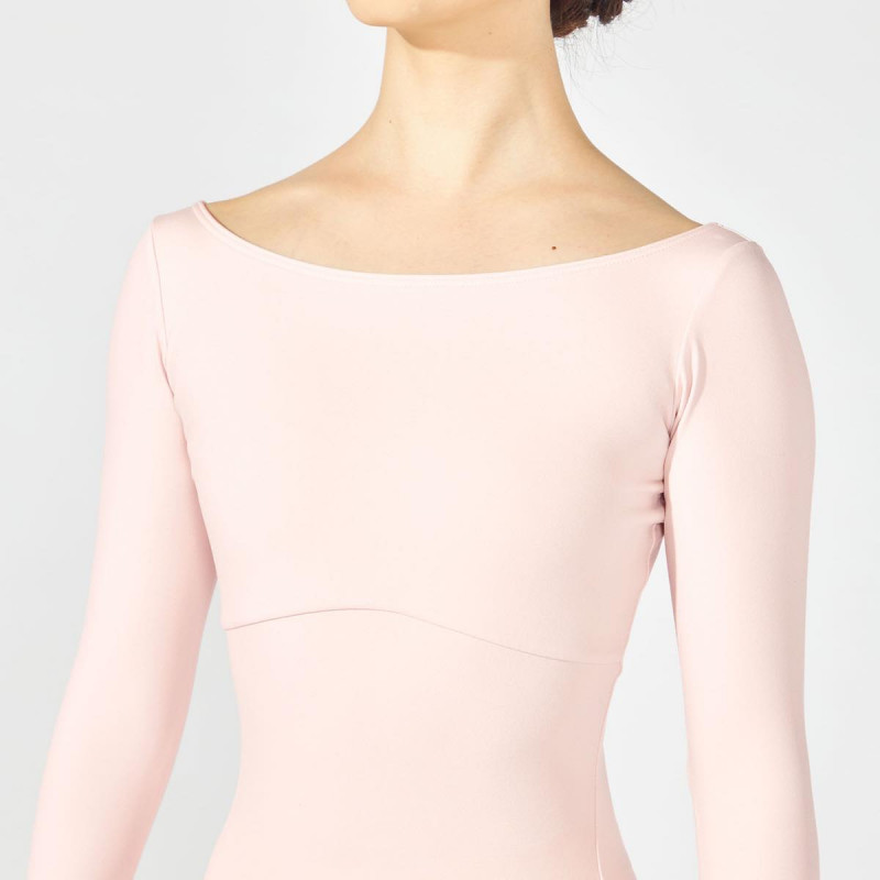 シンプルなデザインながら横に広めに開いた衿ぐりがデコルテを美しく見せ、洗練された印象を与える7分袖レオタード
