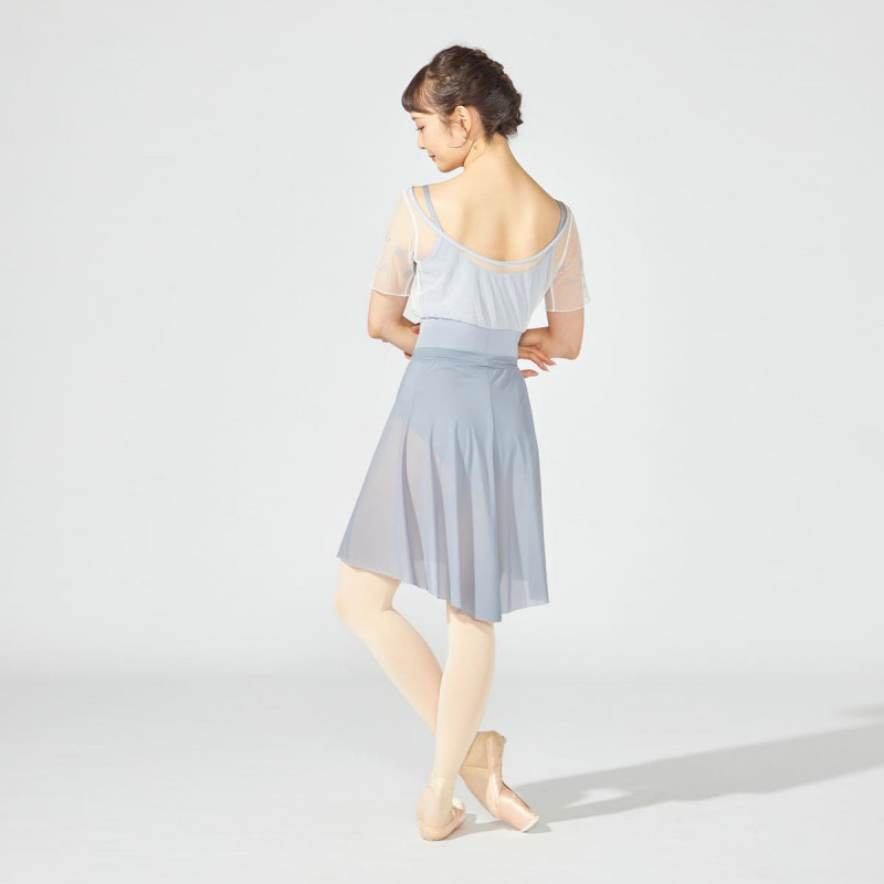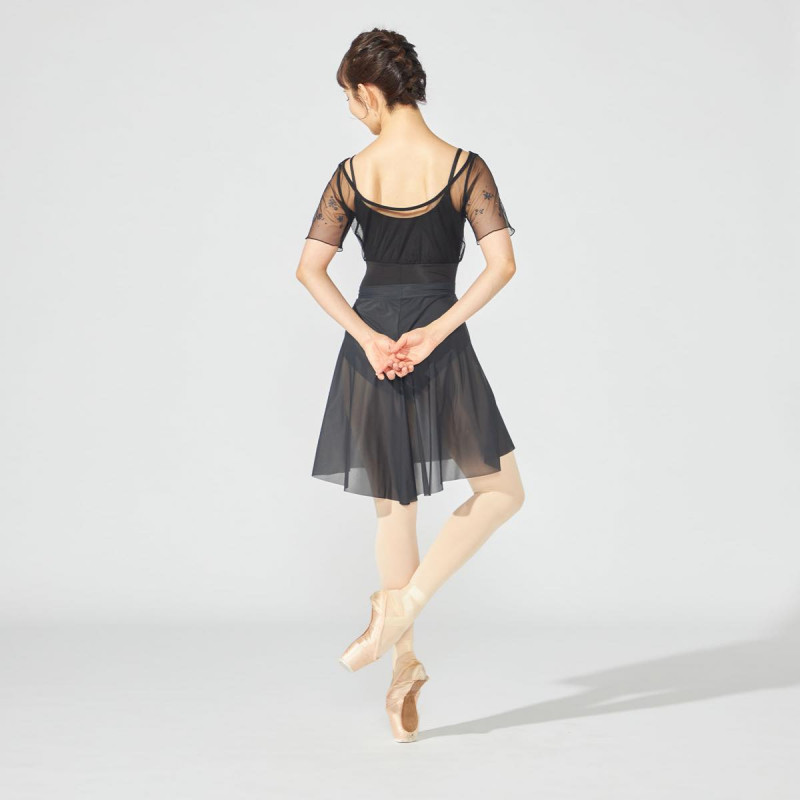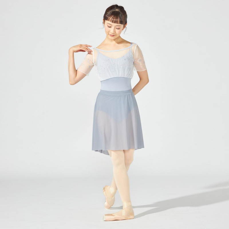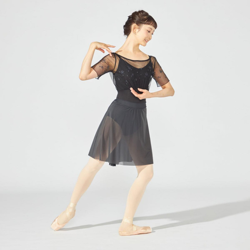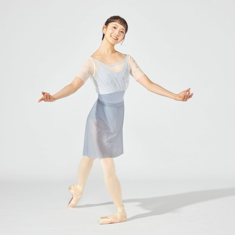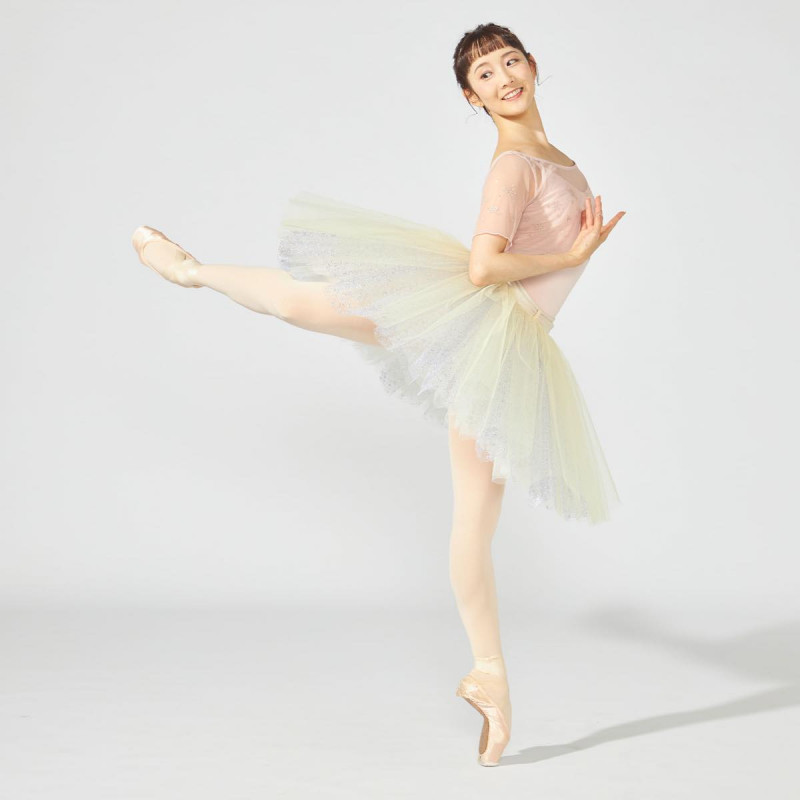 透明感のあるチュールをふわりと纏うデザインがダンサーをより美しく引き立て、光を受けてきらめくクリスタルが上品な華やかさを添える。