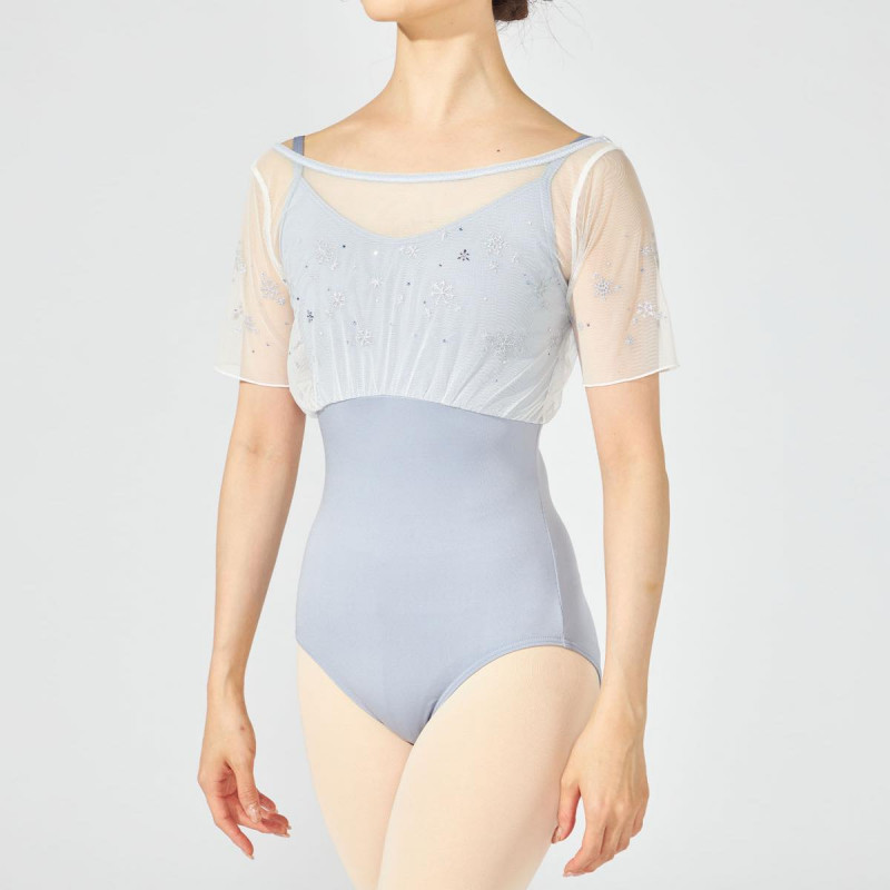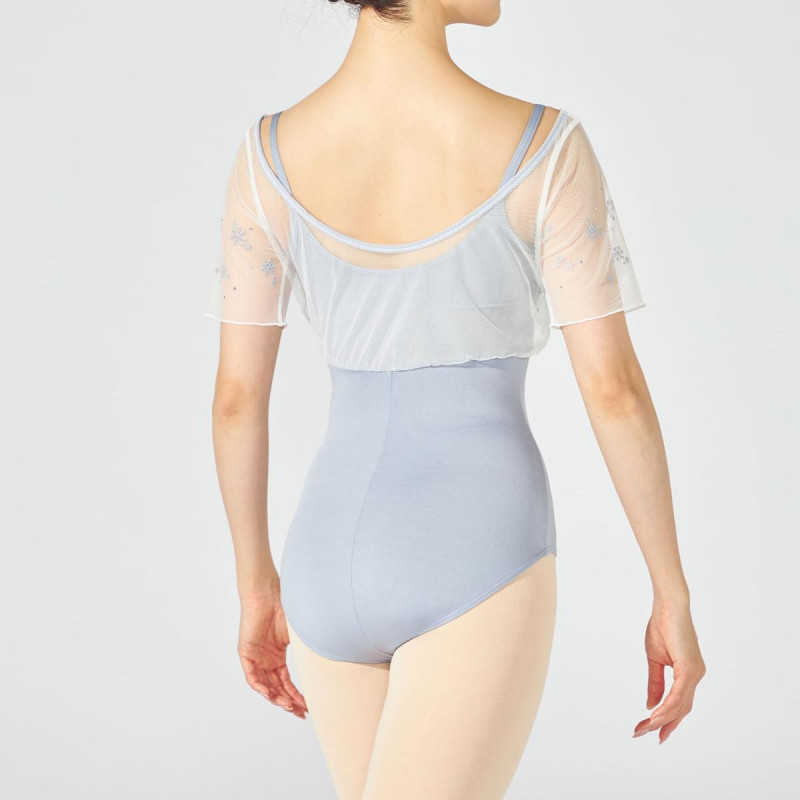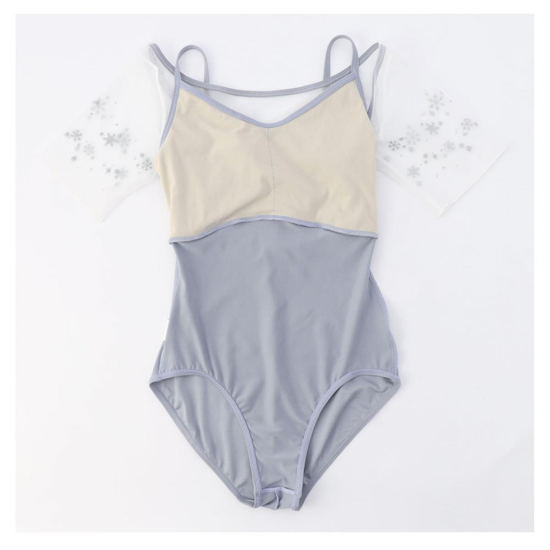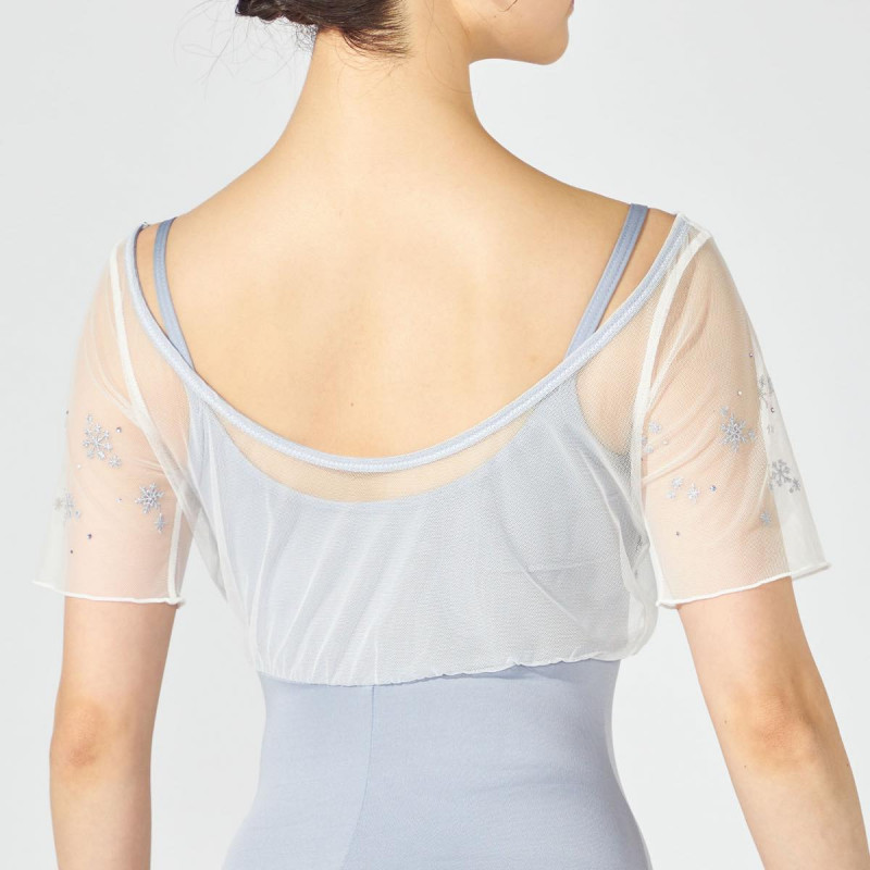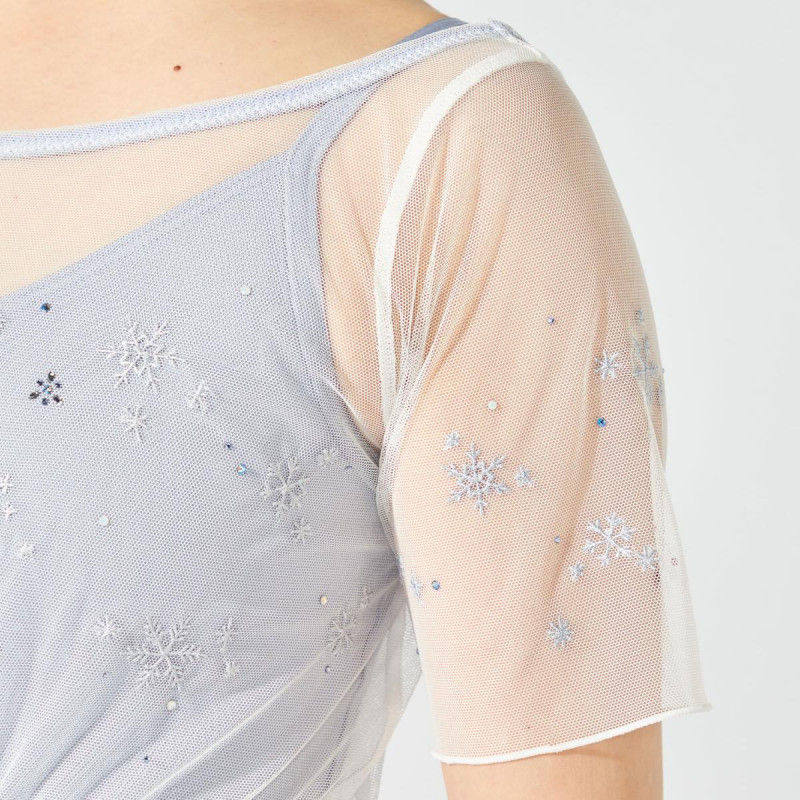 レイヤード風のチュールトップに雪の結晶をモチーフにした刺しゅうを施し、その上からスワロフスキー(R)・クリスタルを散りばめたレオタード