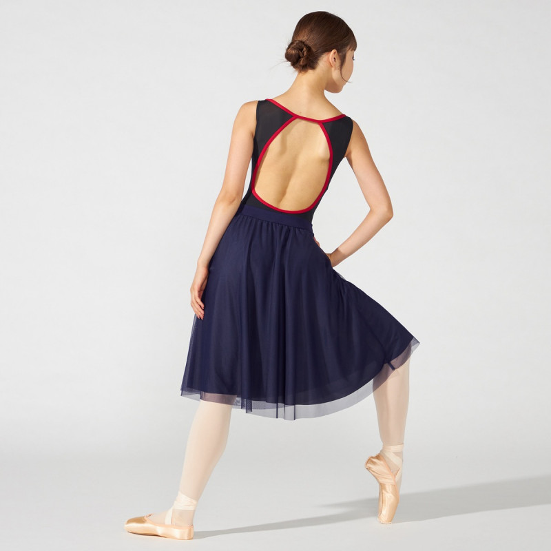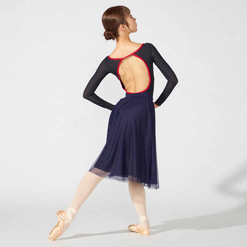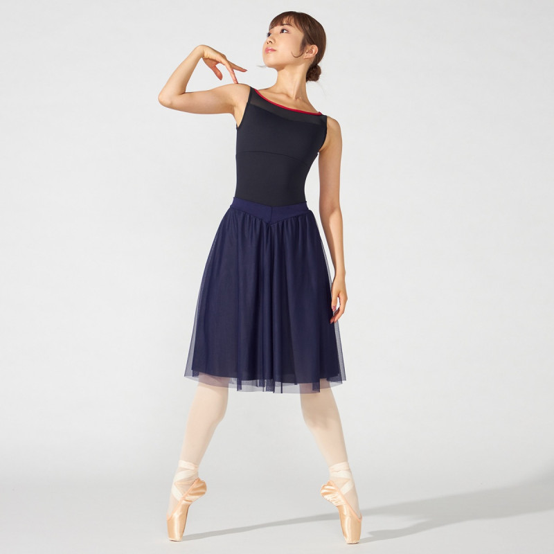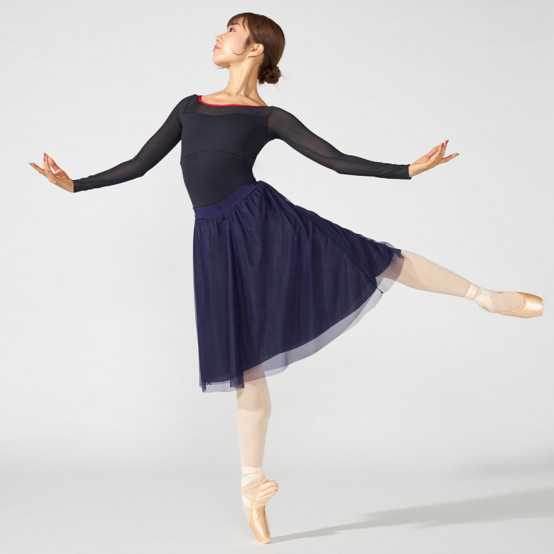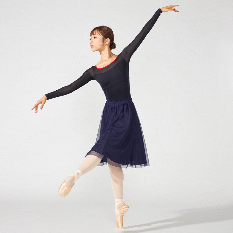 Vカットのウエストラインは、レオタードの切り替えにぴったりと合うだけでなくウエストまわりをすっきりと見せる。