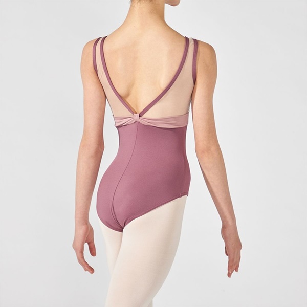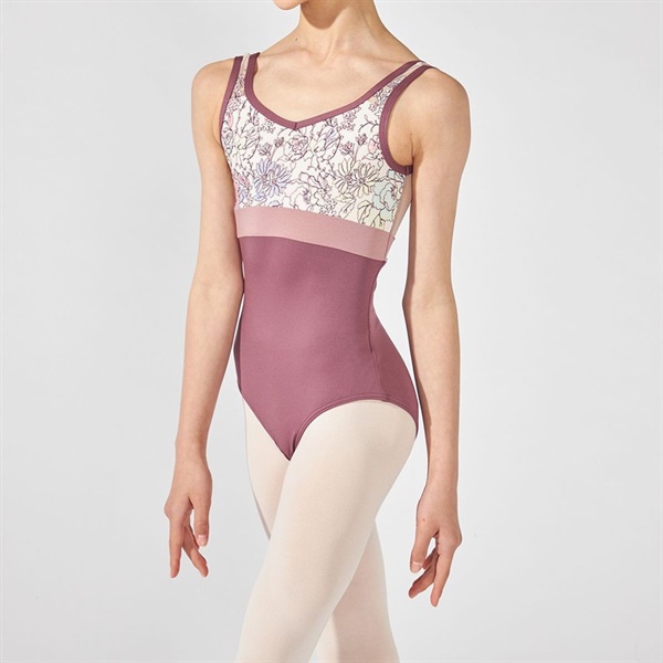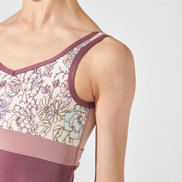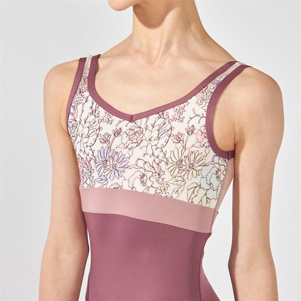 上身頃に贅沢に使用したエンブロイダリーチュールが華やかなノースリーブレオタード