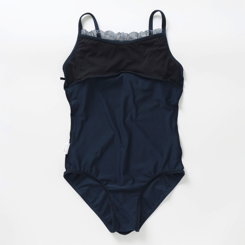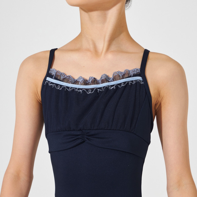 繊細な刺しゅうを施したエンブロイダリーチュールを使用したキャミソールレオタード