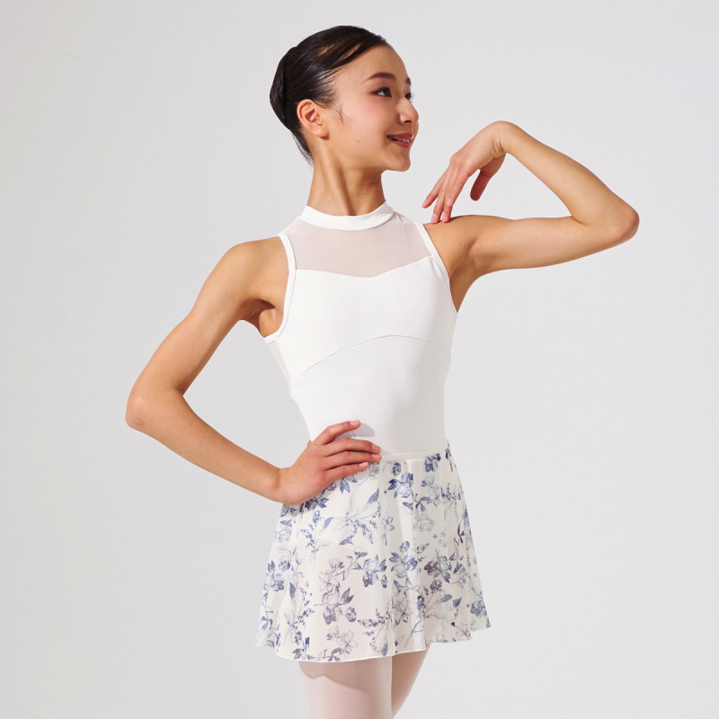 チュールで切り替えられた胸元はデコルテが透けており、首回りを美しく見せる。
