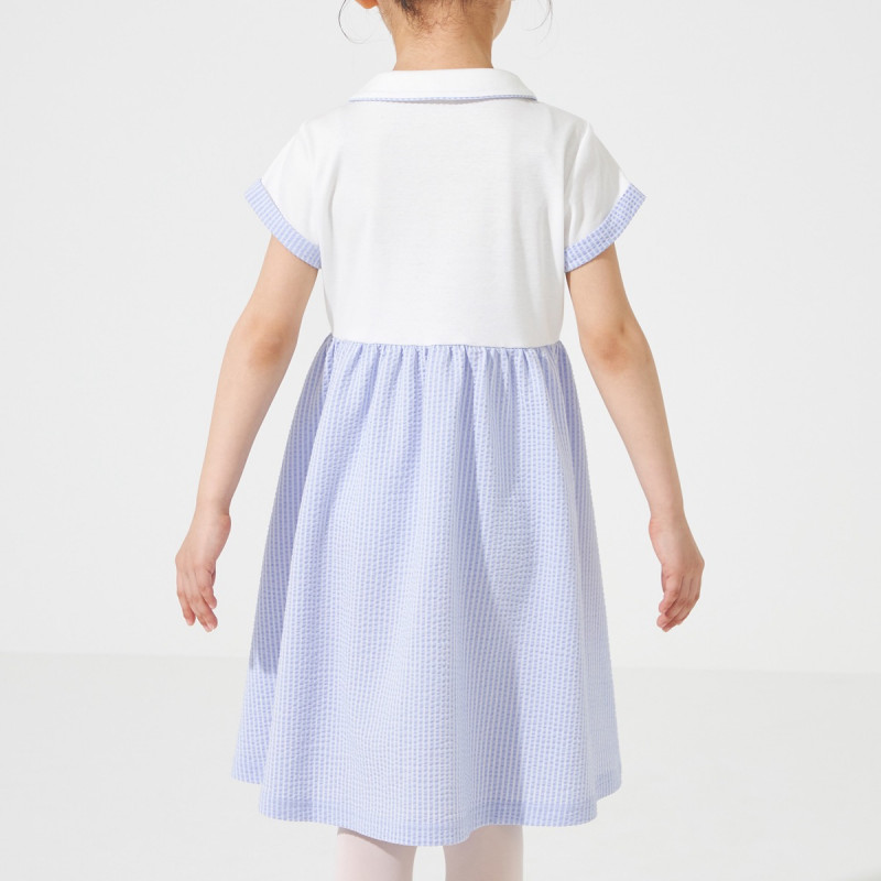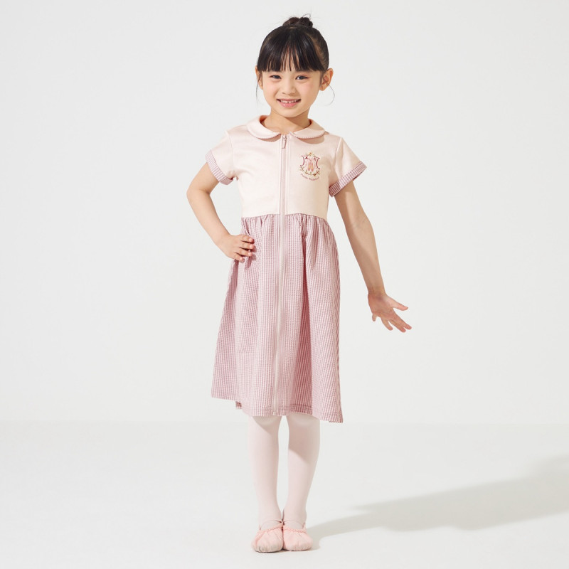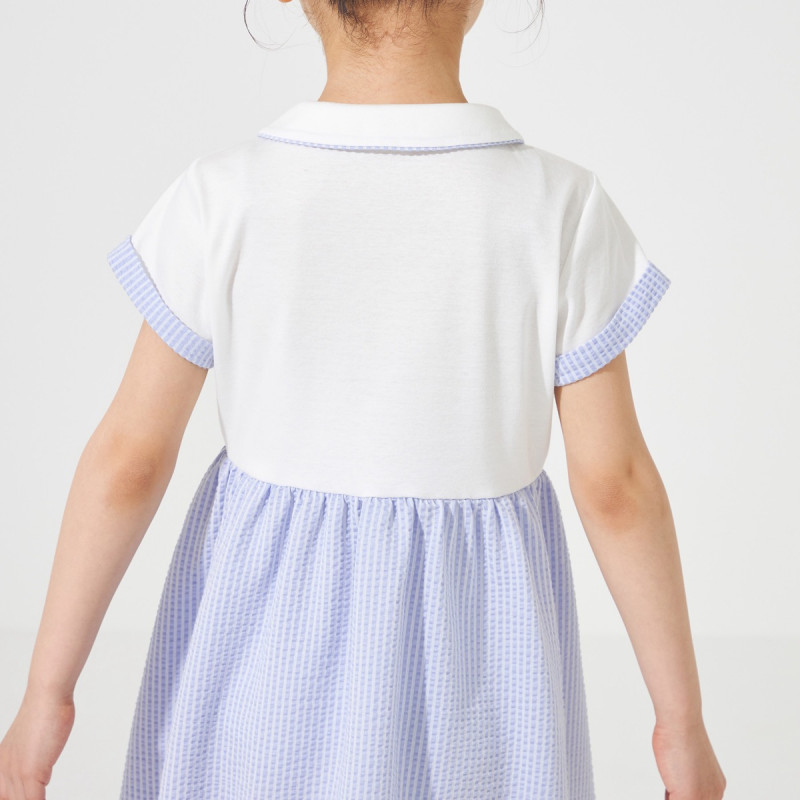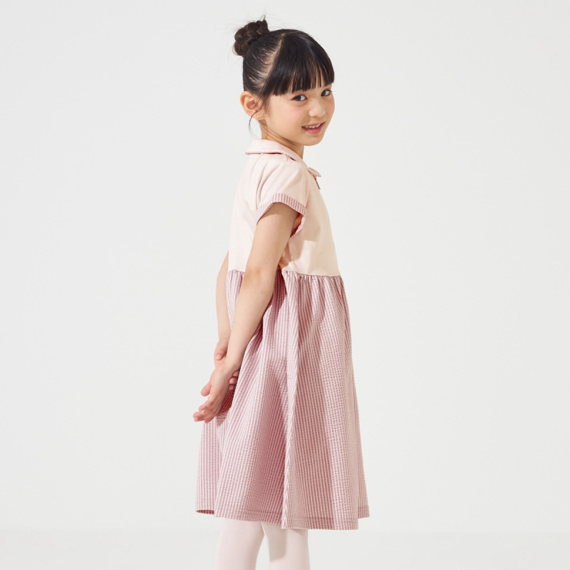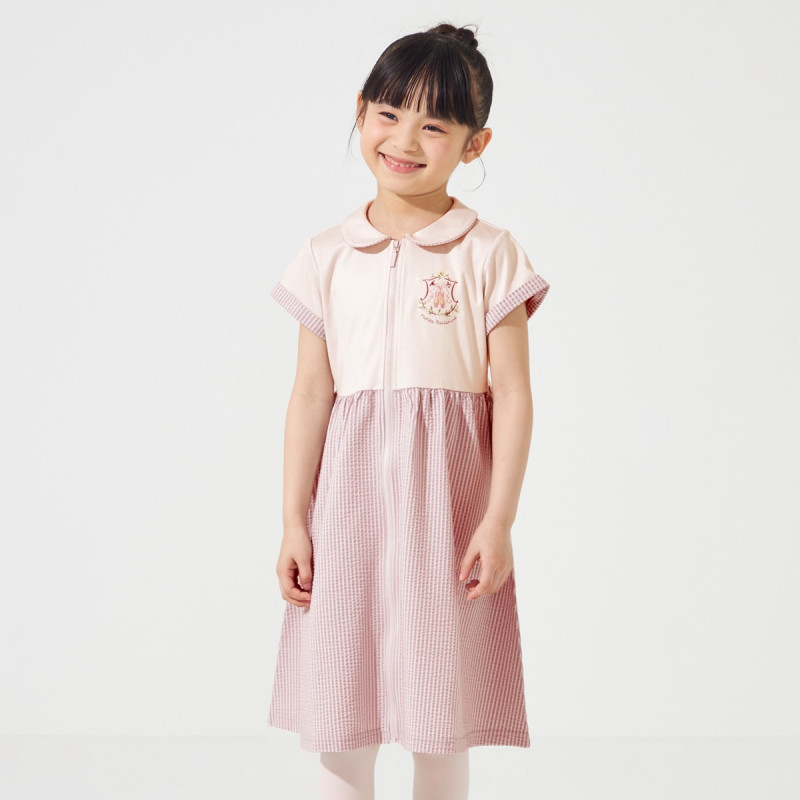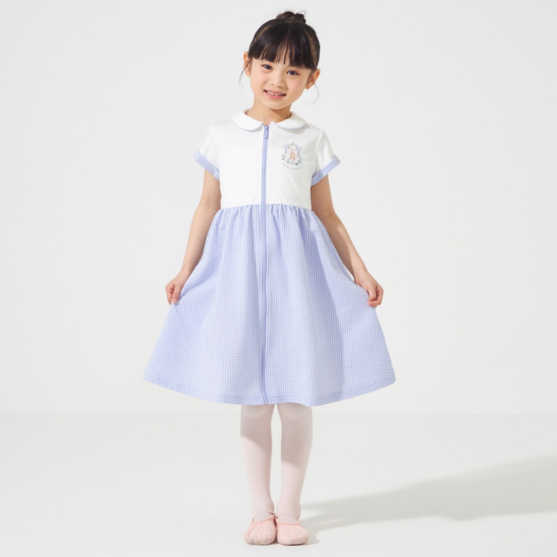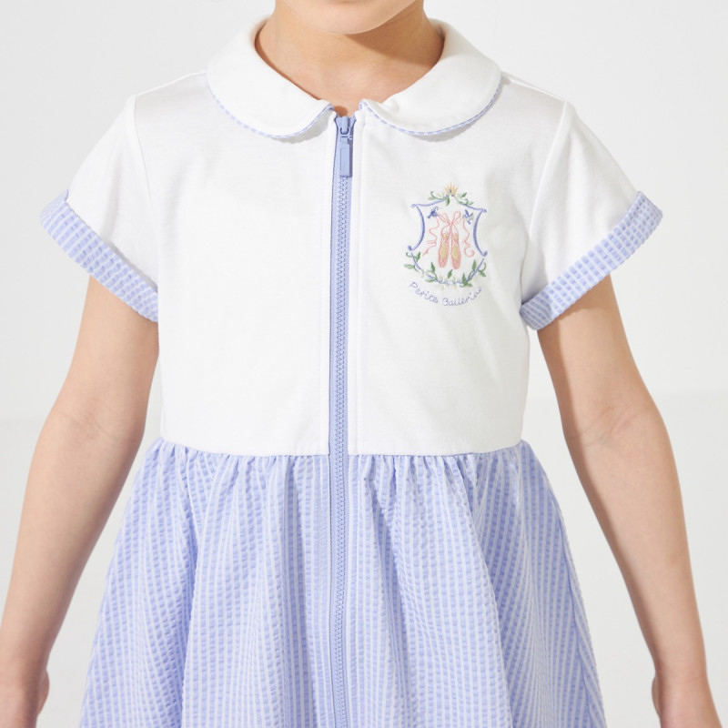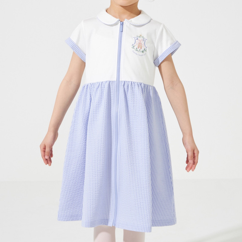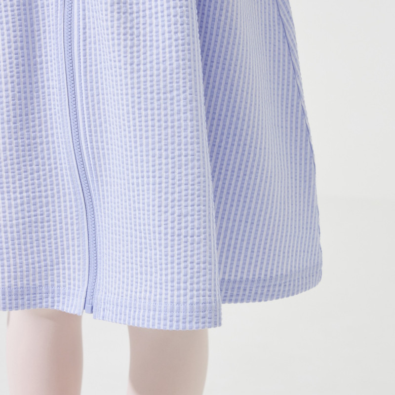 スカートと袖先に凹凸感のあるサッカー生地を使用したジップアップワンピース