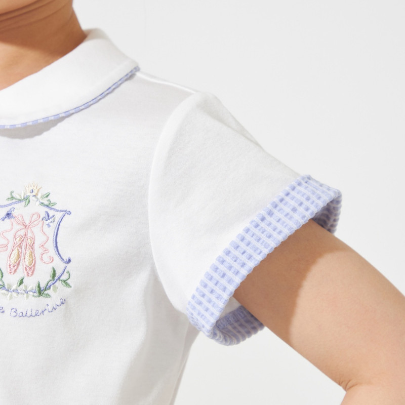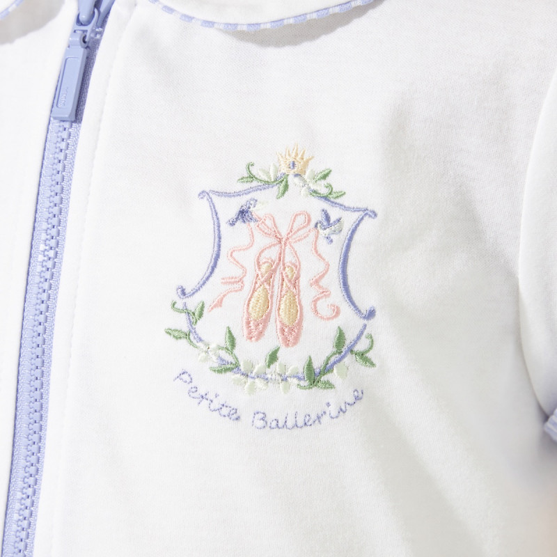 胸元のトゥシューズと小鳥の刺しゅうがエレガントかつ上品な印象。