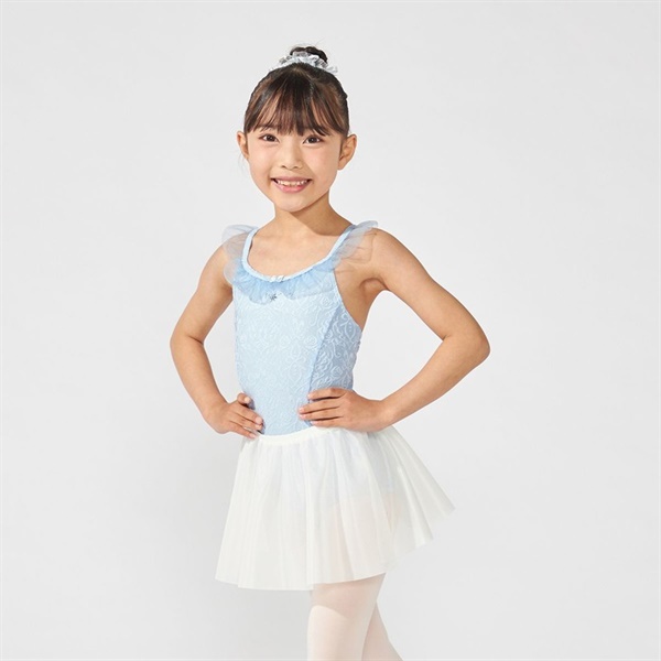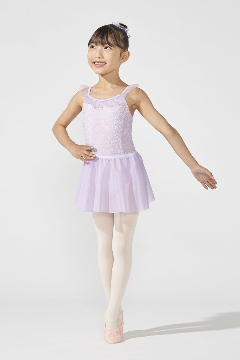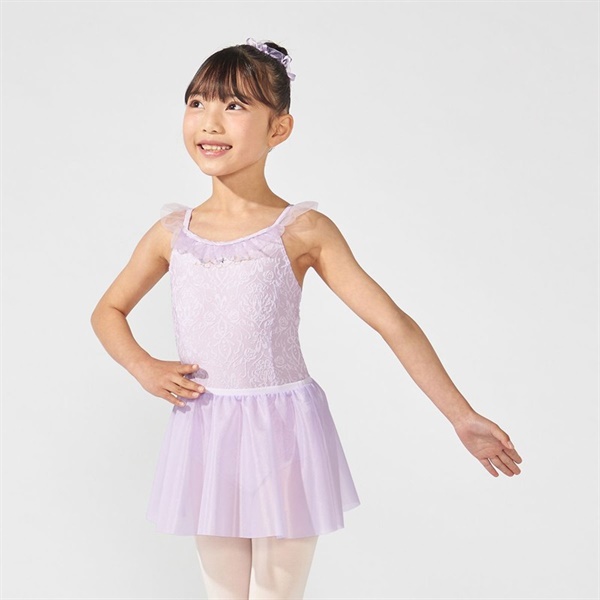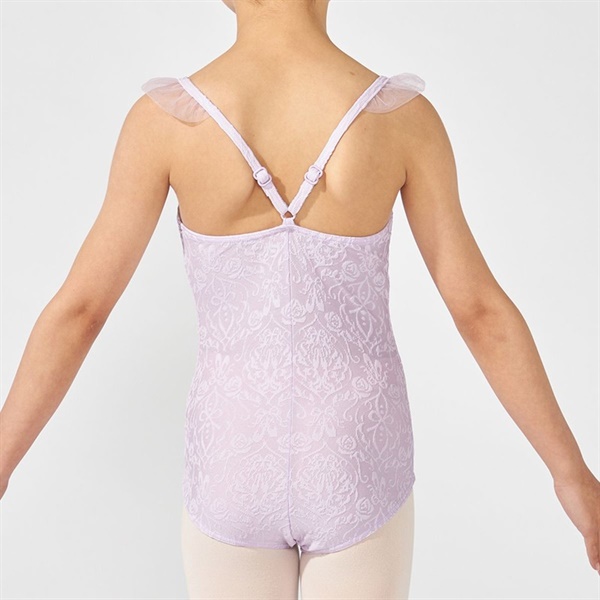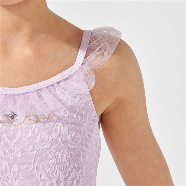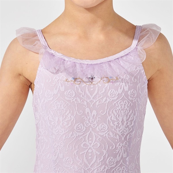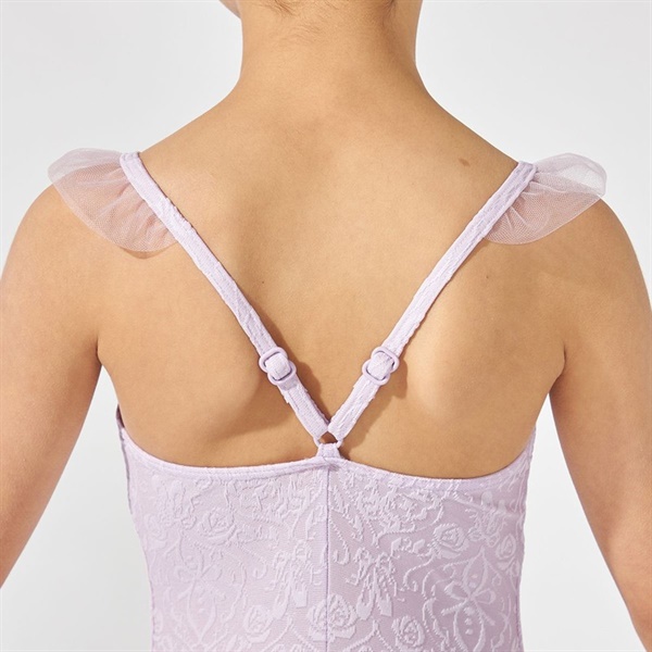 胸元から肩にかけてチュールを挟み込み、プリンセスラインが華やかなキャミソールレオタード