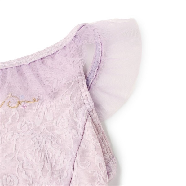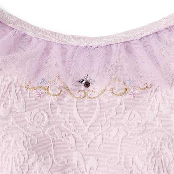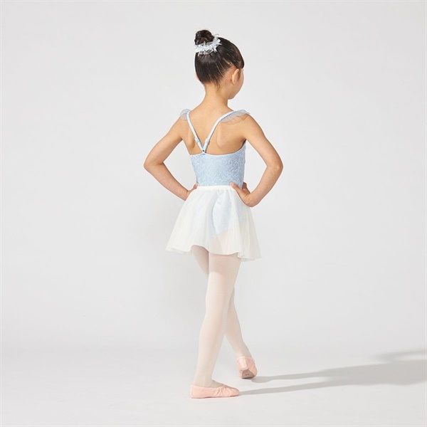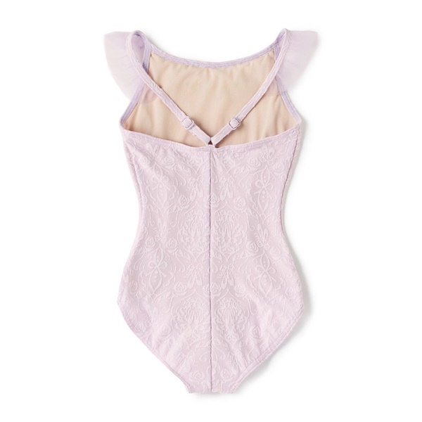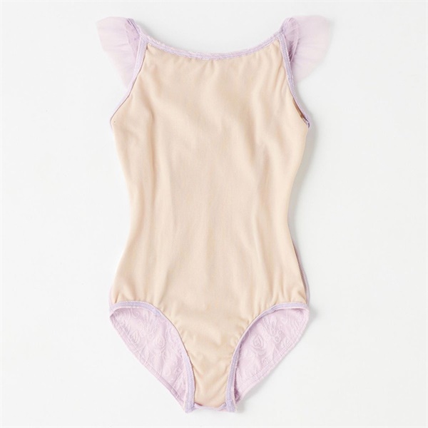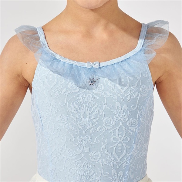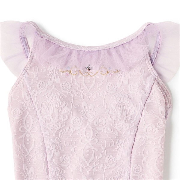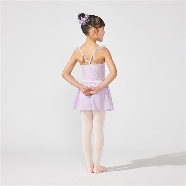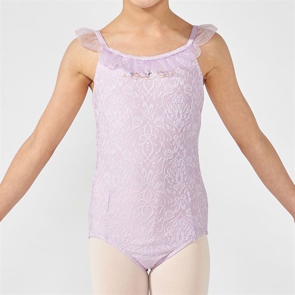 胸元から肩にかけてチュールを挟み込み、プリンセスラインが華やかなキャミソールレオタード
