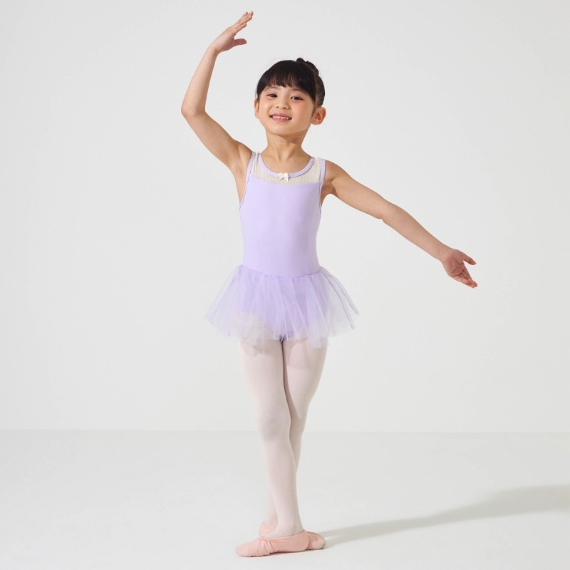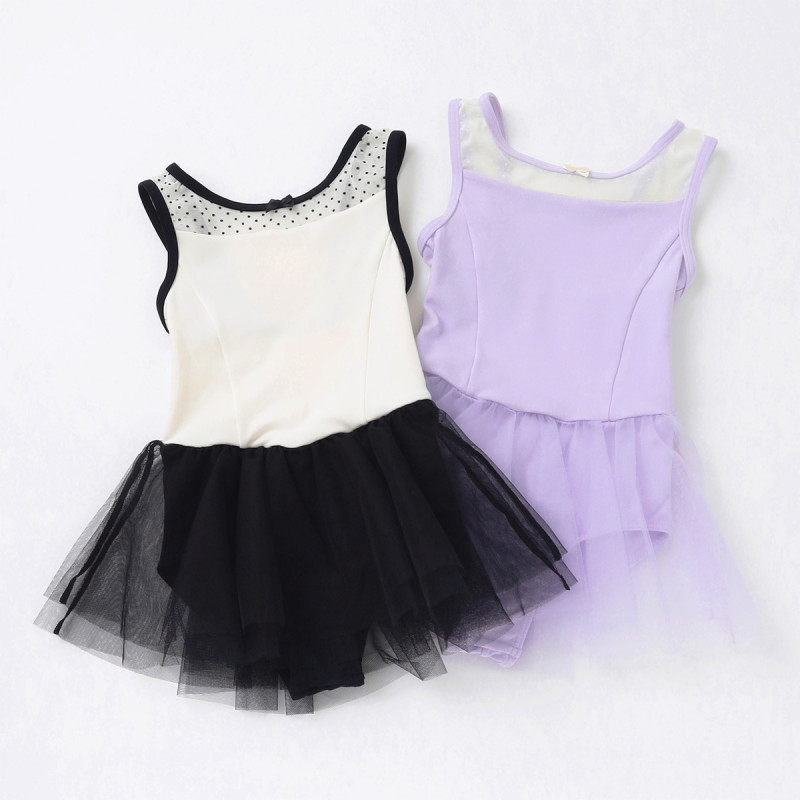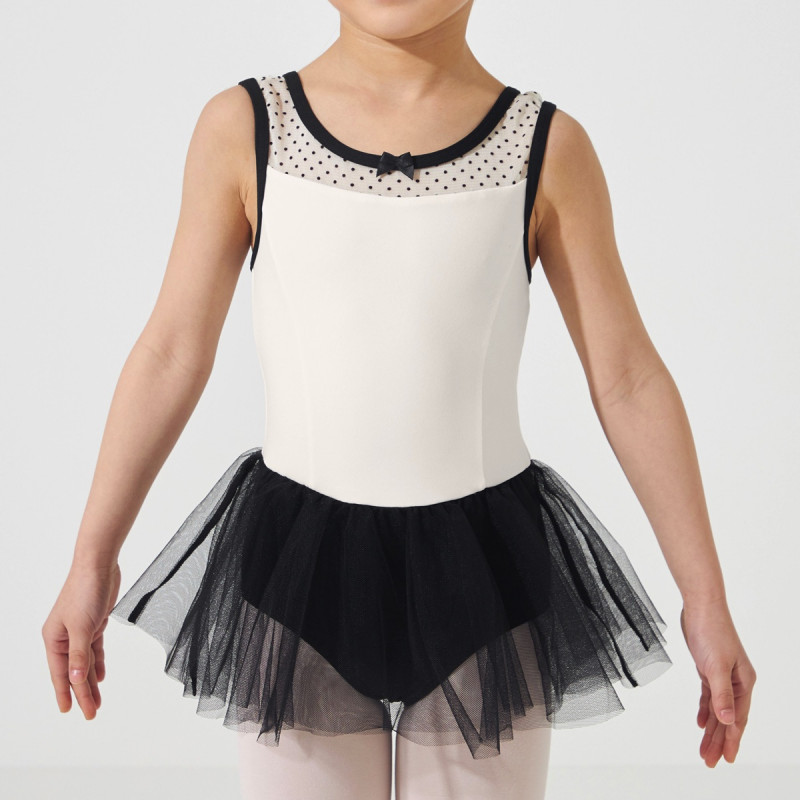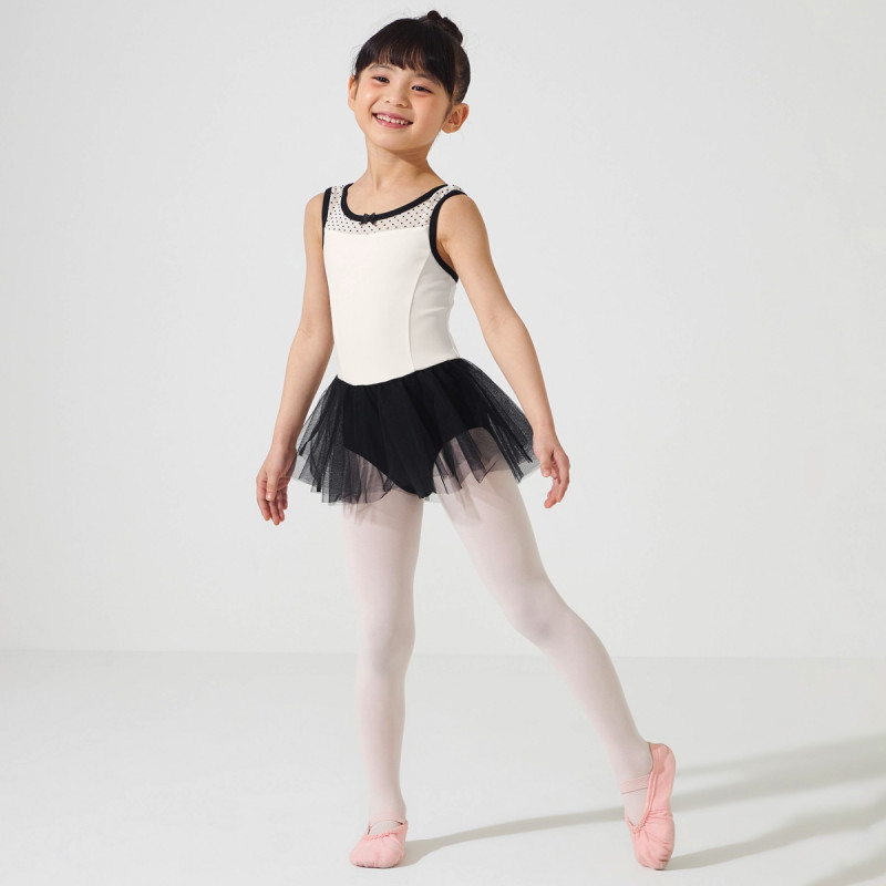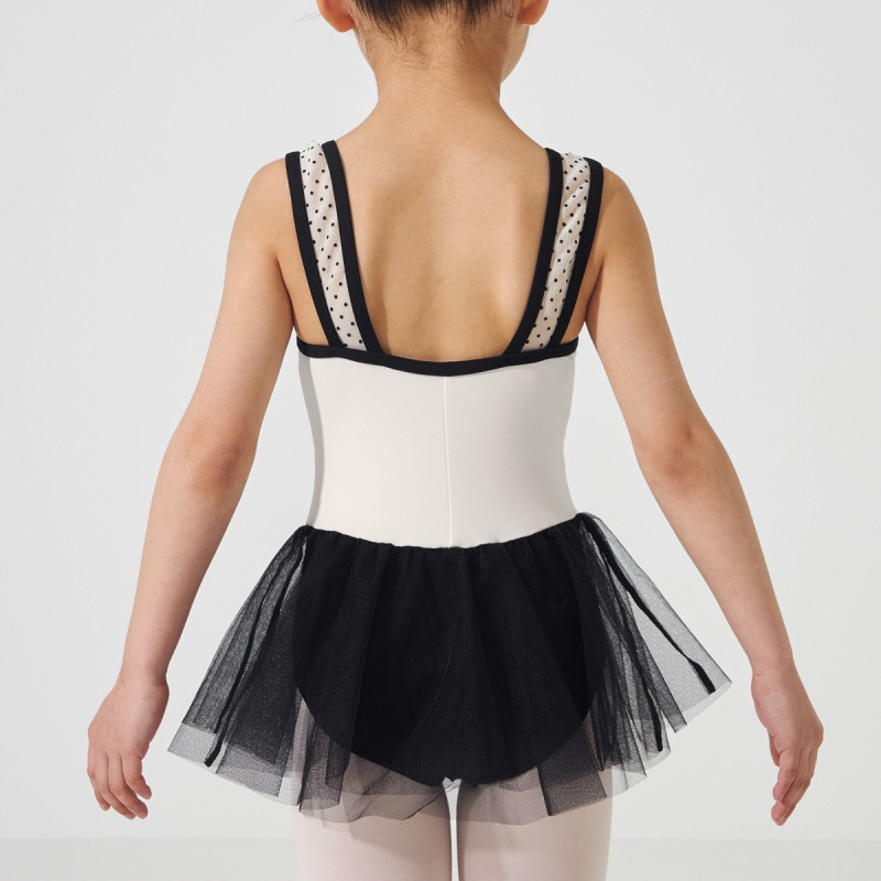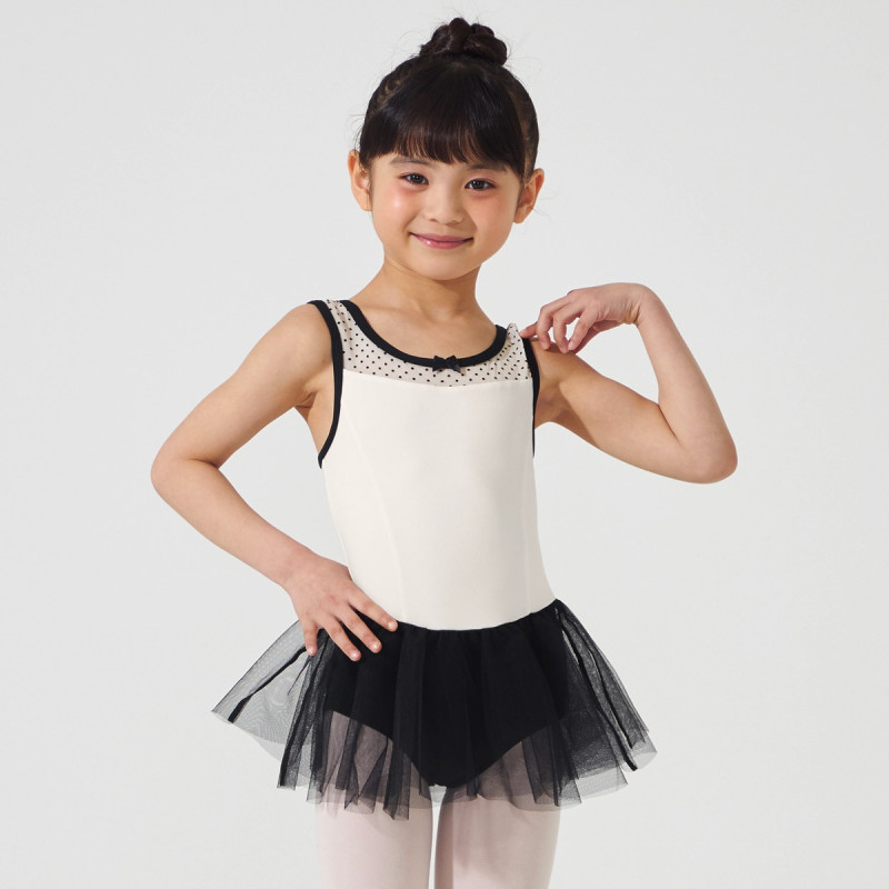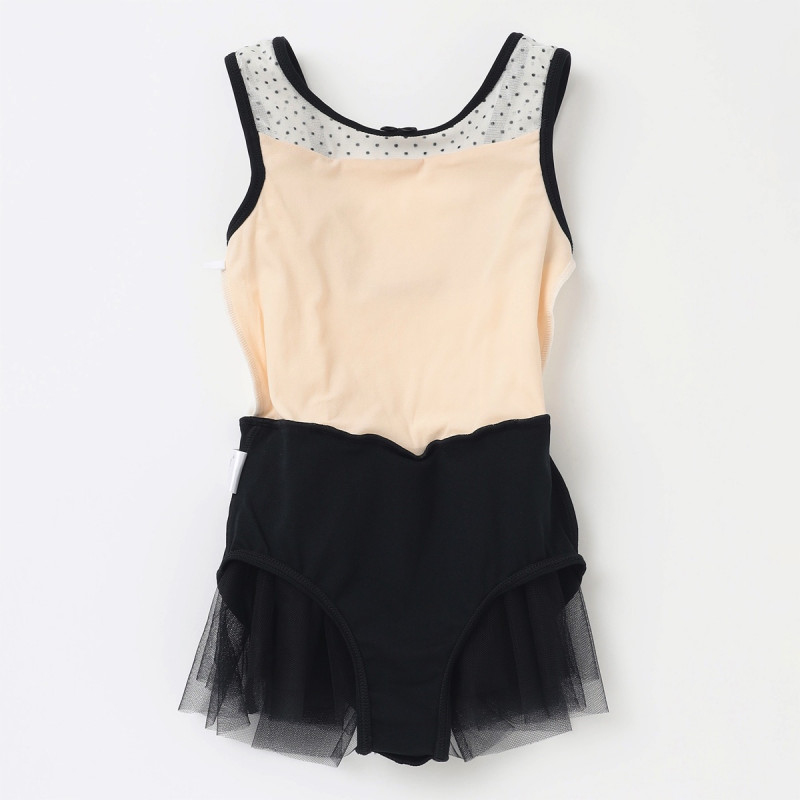 胸元の切り替えからバックにかけてのドットが印象的なスカート付きレオタード