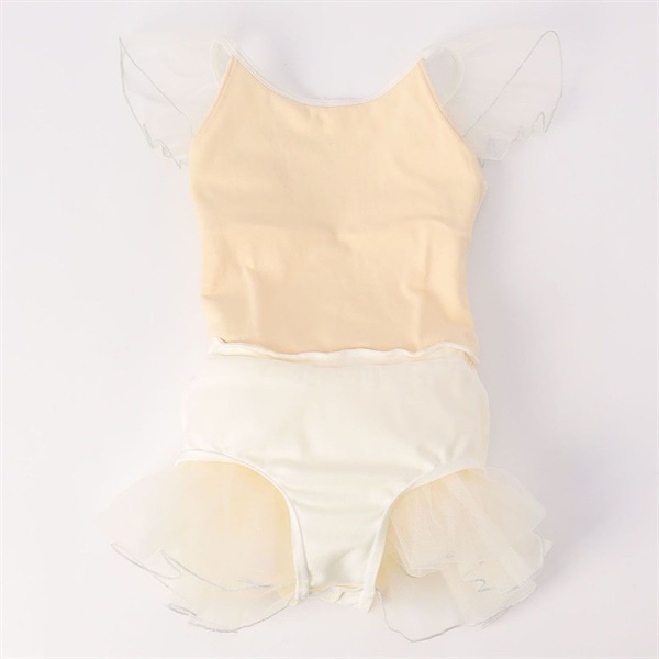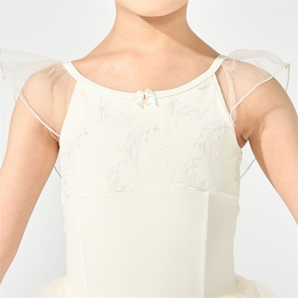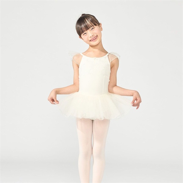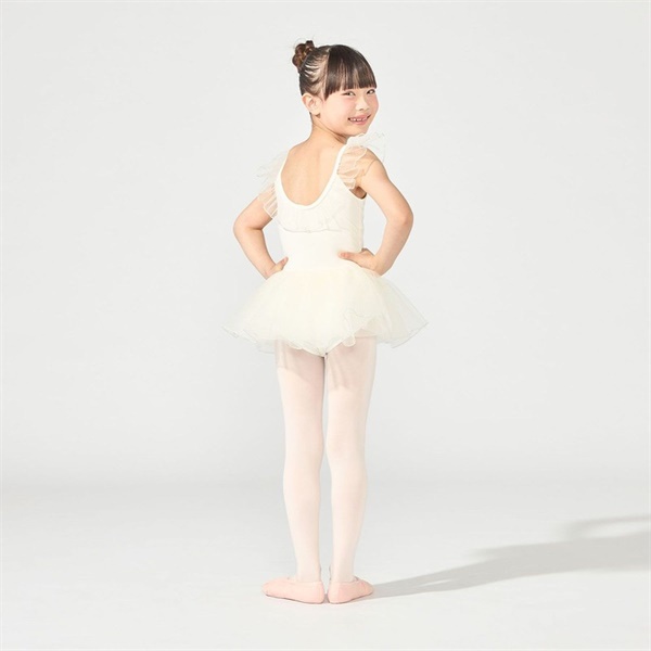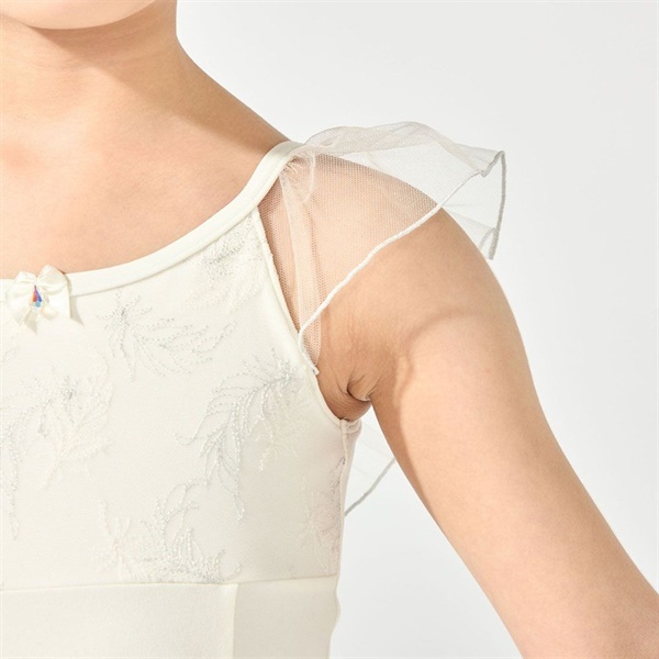 袖から背中にかけてのフリルが軽やかで羽のようなディテールのスカート付レオタード