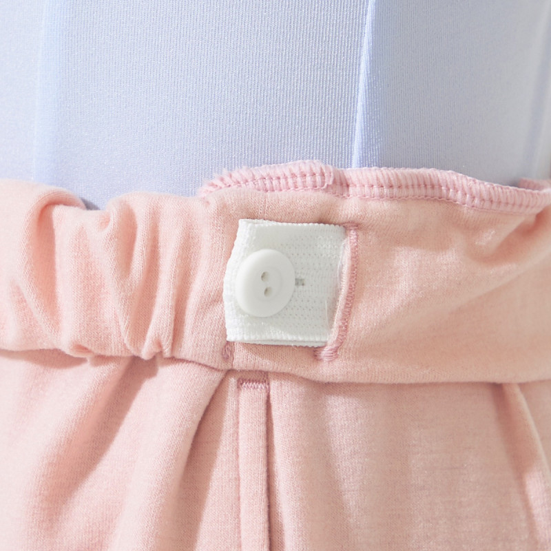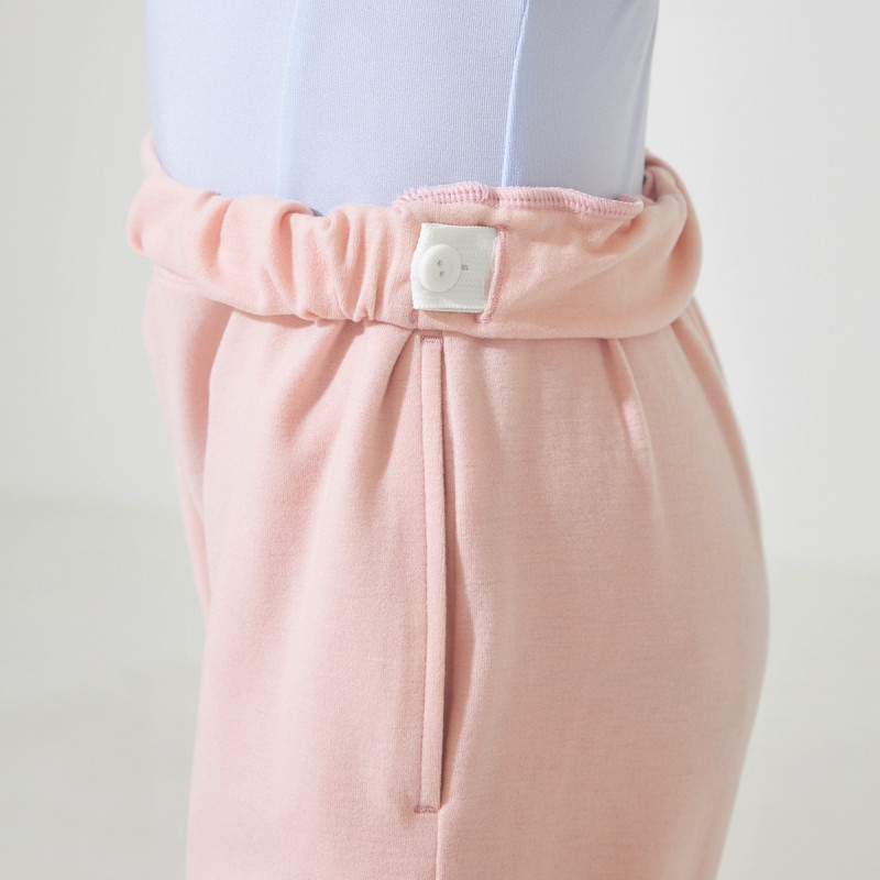 両サイドポケット付き、サイズ調整が可能なウエストゴムアジャスター、裾にスピンドルゴム入り仕様。