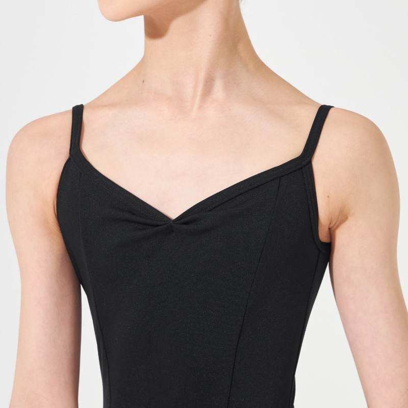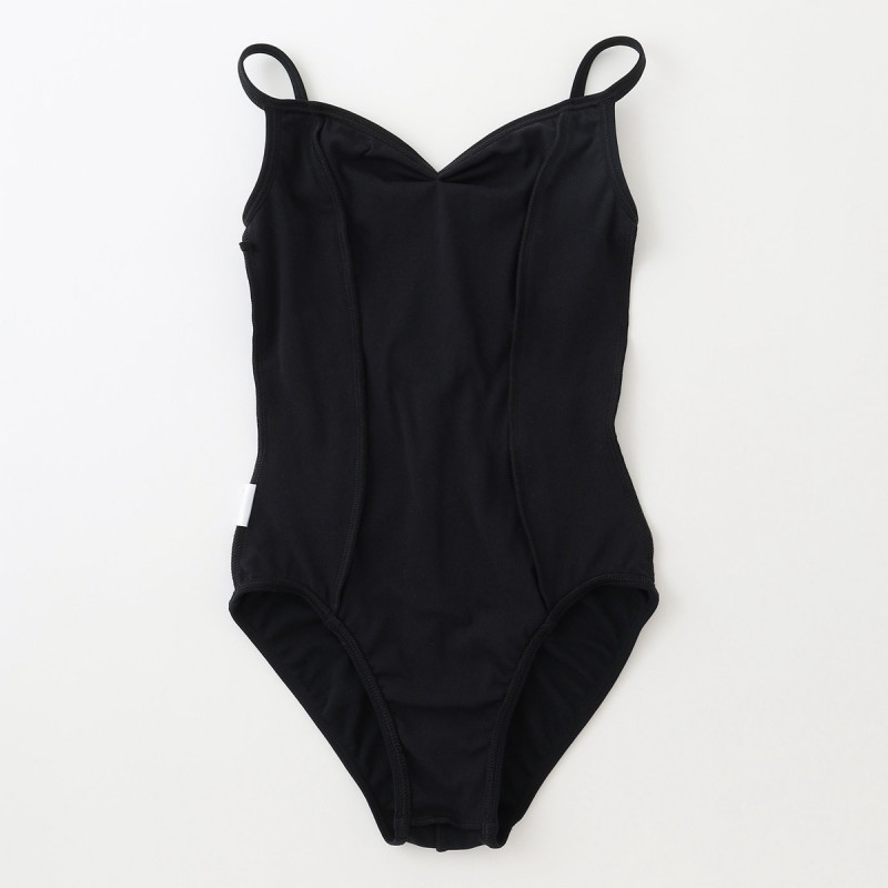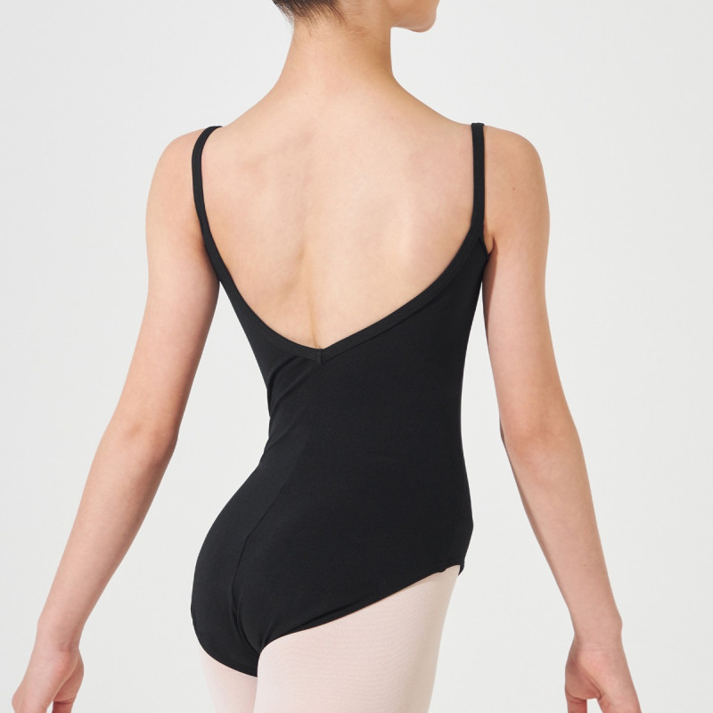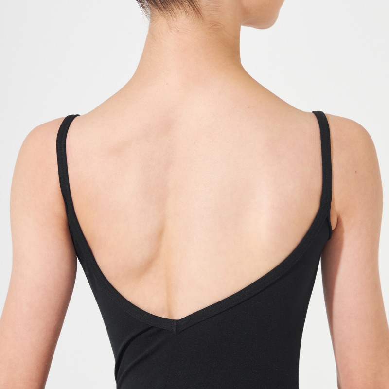 身体を細く見せる見頃のラインや肩甲骨の動きを妨げずに背中を美しく見せる横に広めに開いたカッティングなど細部に拘ったレオタード。