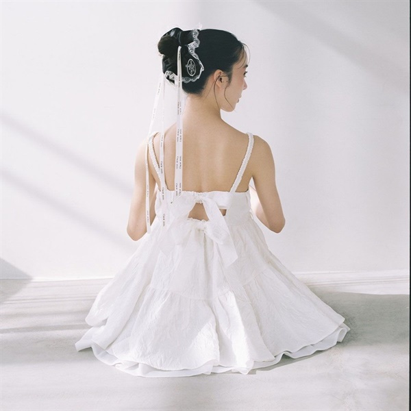 胸元はフィット感を出し、胸下位置に長めのリボンをプラス。中央にはホックテープを加えてバレエのコルセットディテールを表現しました。裾に向かって広がるティアードラインは、腰回りをふんわり優しくカバーしてくれます。裾にはシアー感のあるオーガンジー生地をドッキングさせ、女性らしい抜け感を加えました。肩紐は安定感と伸縮性のある太めギャザーゴムストラップを使用。背中側はゴムでギャザーを入れてフィット感を出し、リボンを配置してバックシャンに。被りでご着用いただくアイテムです。裏地のスカートがタイトになっているのでフレアシルエットでも安心して着ていただけます。