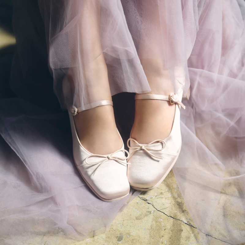 リボン付きのバレエシューズ風デザインに、スクエアトゥと安定した履き心地のストラップを組み合わせたメリージェーン。