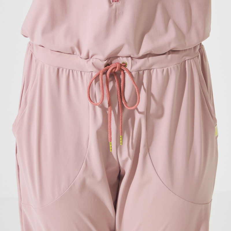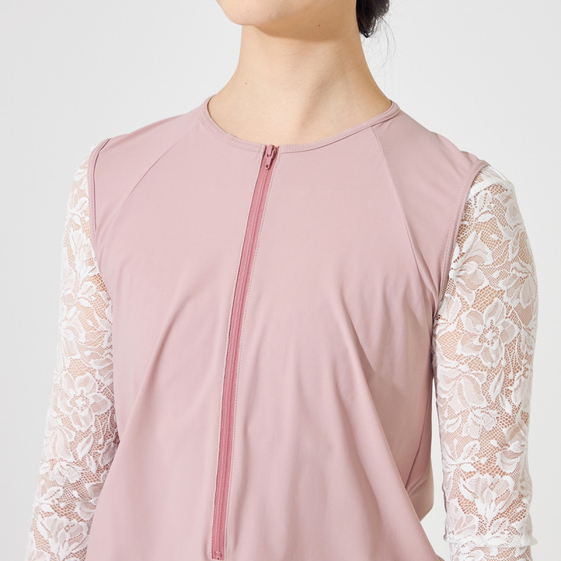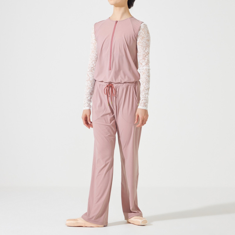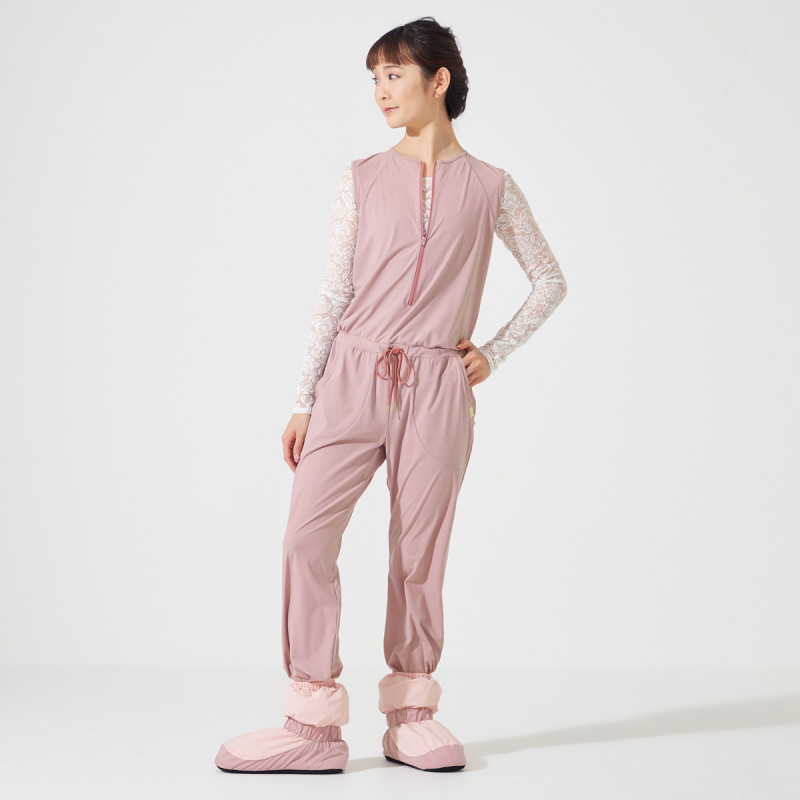 前ファスナー開きで腰までトップを落としても着用できるデザインのオールインワン