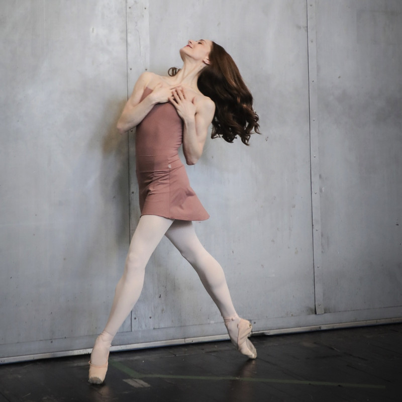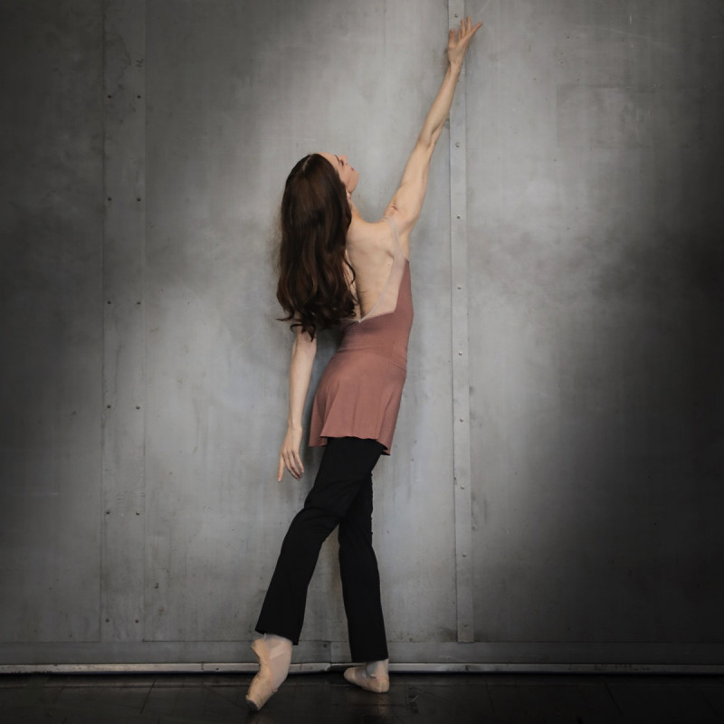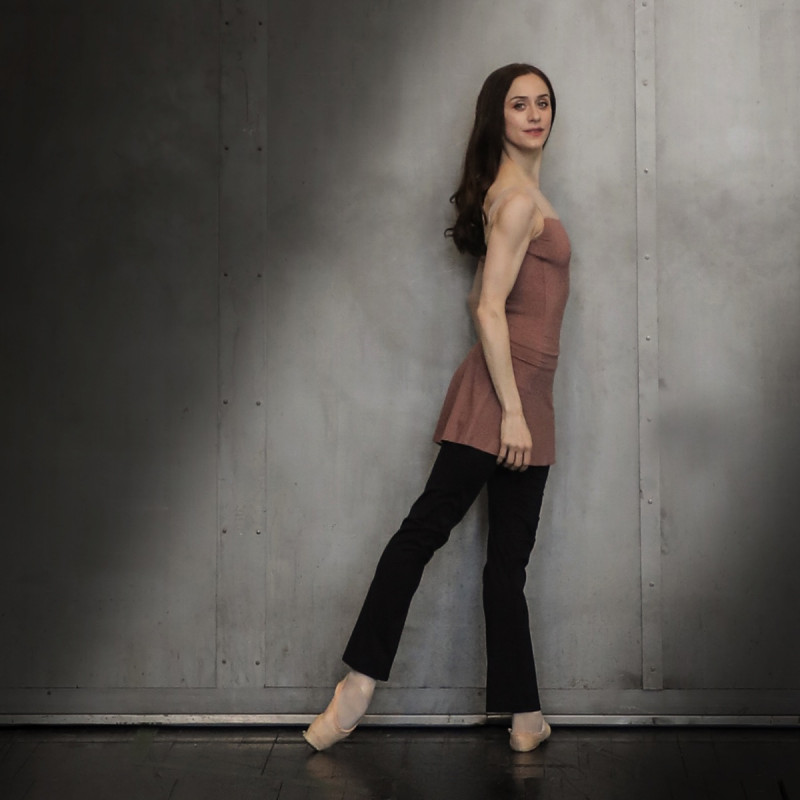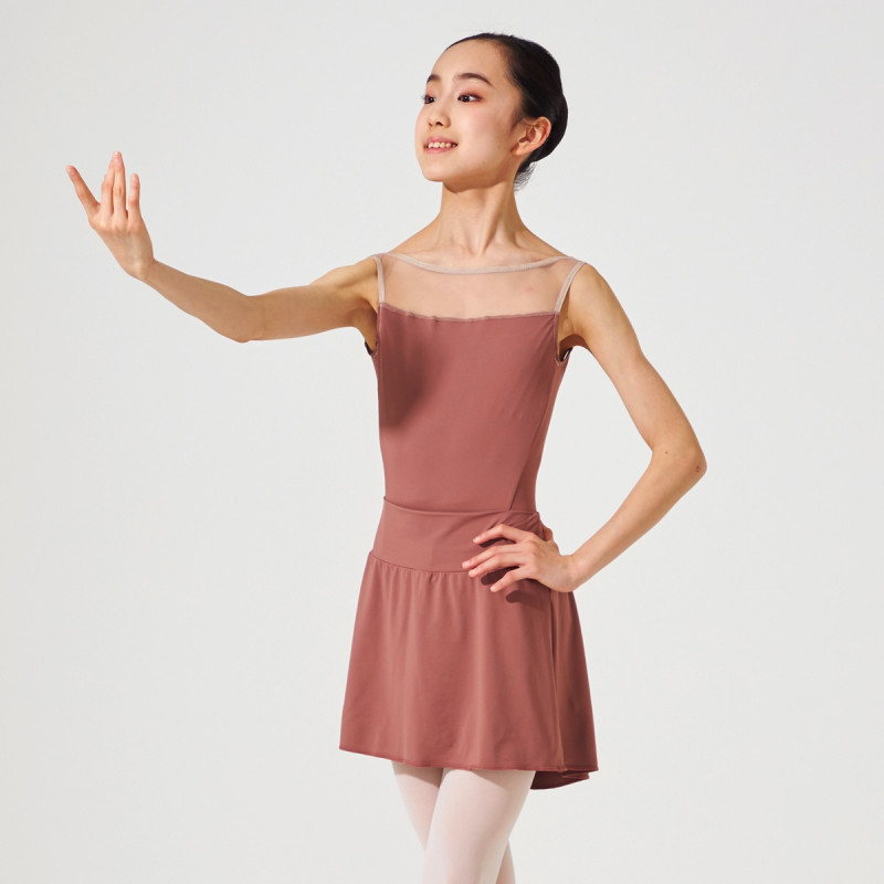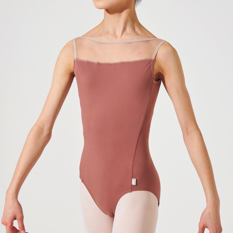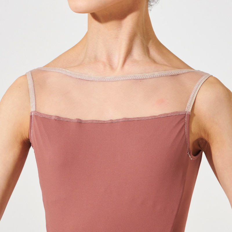 直線的なカットがモダンな印象のネックラインが特徴のノースリーブレオタード