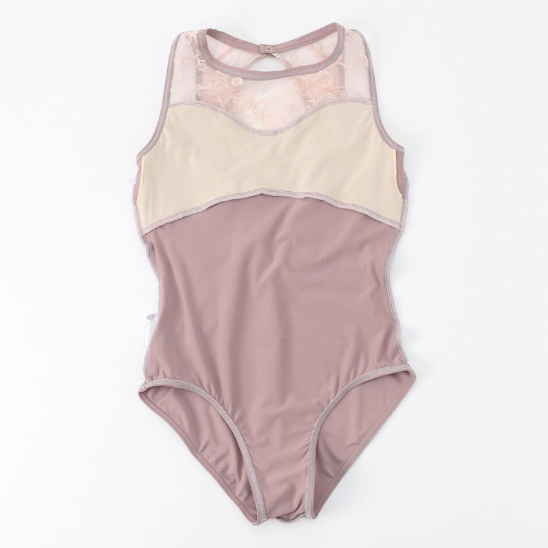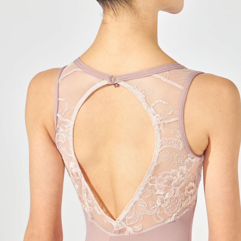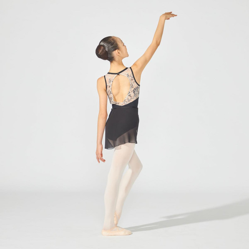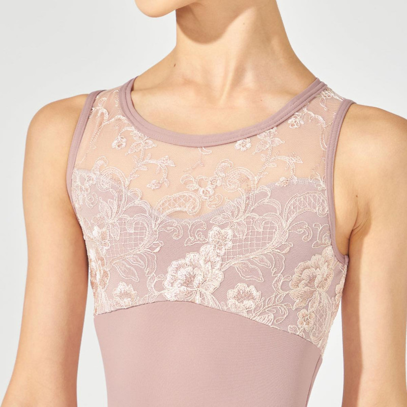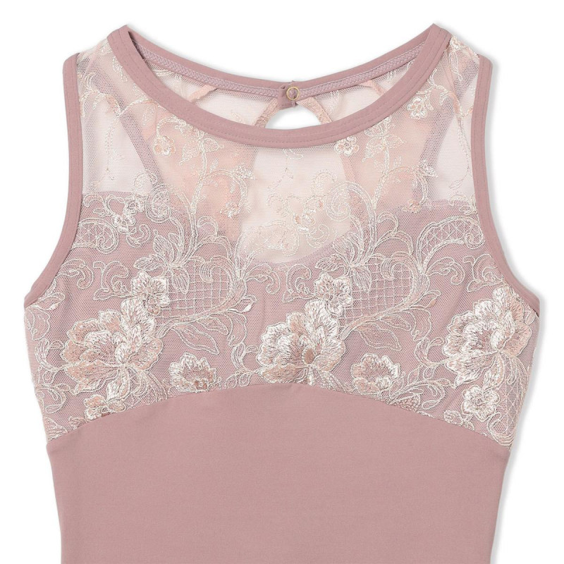 コード糸を用いてボタニカル柄を立体的に表現した、エレガントで高級感のあるエンブロイダリーチュールをバストアップとバックスタイルに使用したノースリーブレオタード