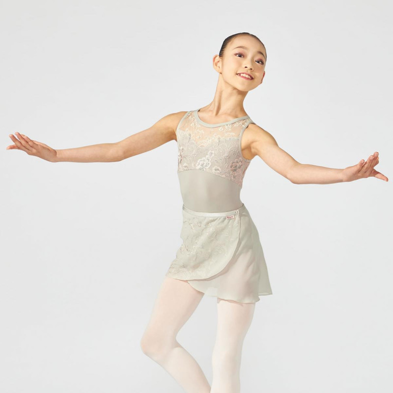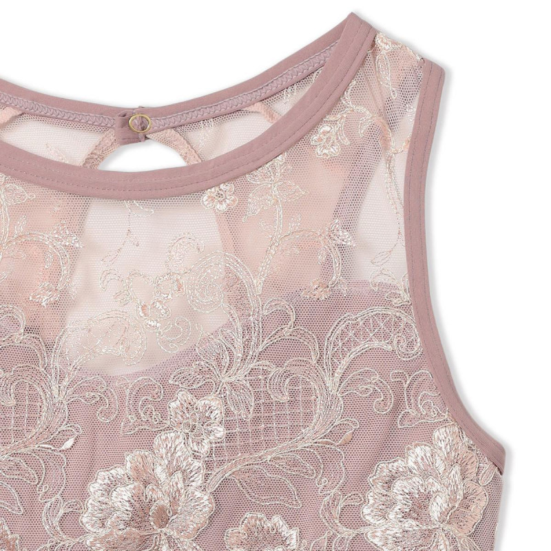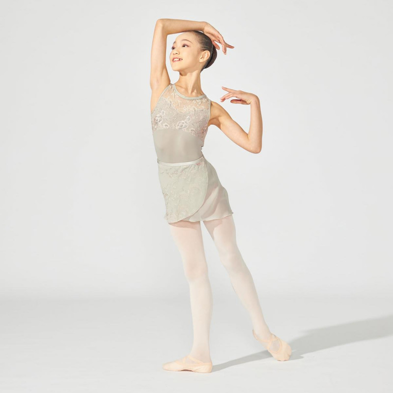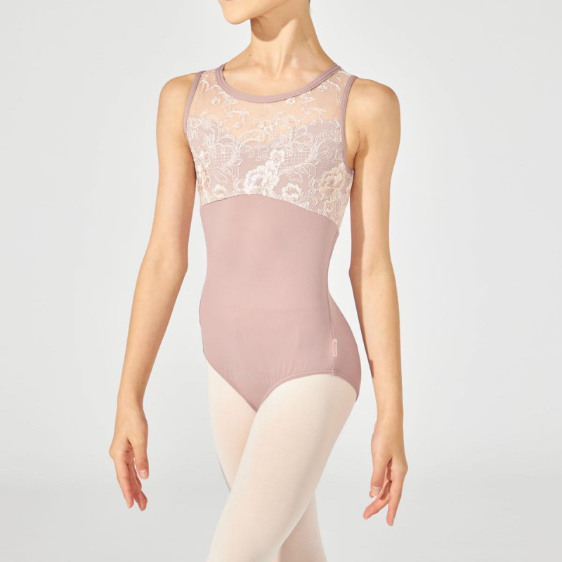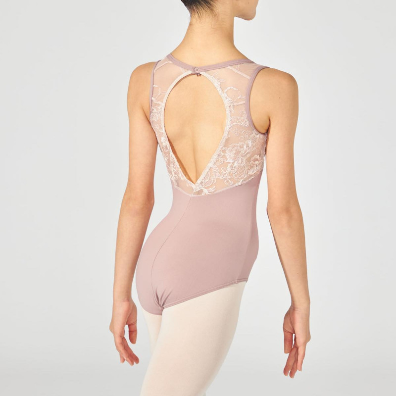 コード糸を用いてボタニカル柄を立体的に表現した、エレガントで高級感のあるエンブロイダリーチュールをバストアップとバックスタイルに使用したノースリーブレオタード