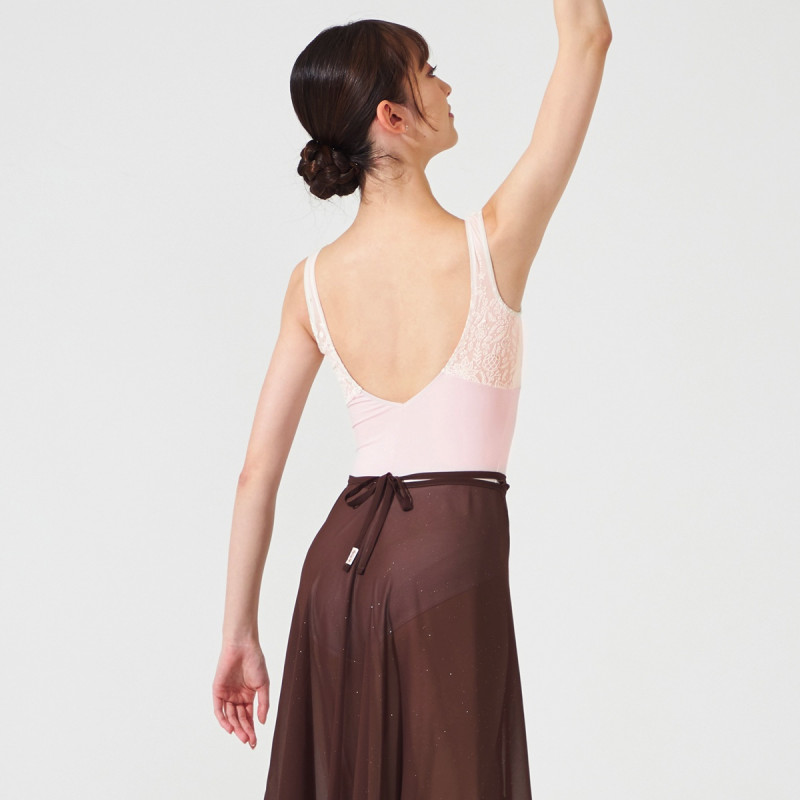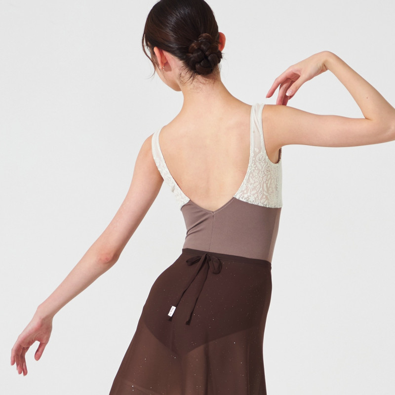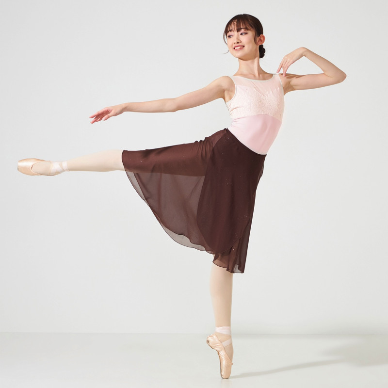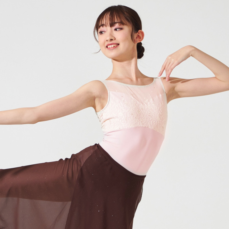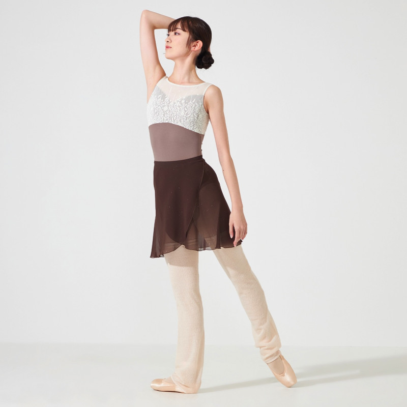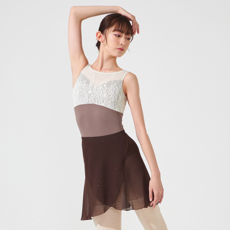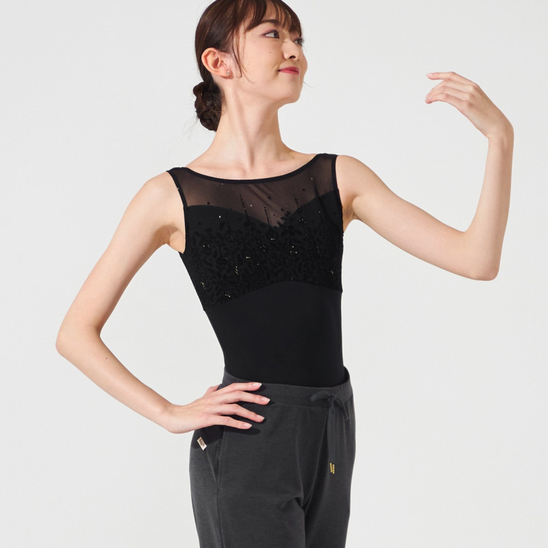 オリジナルフロッキープリントを載せたチュールと、優れたストレッチ性とフィット感、着心地の良さが人気のソフトスムース素材を使用。