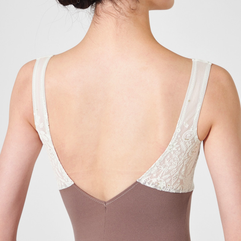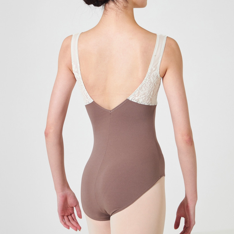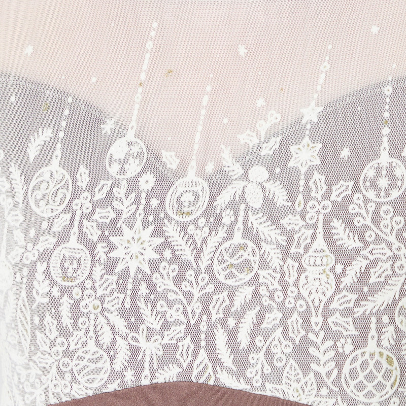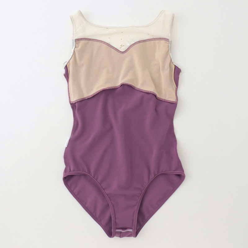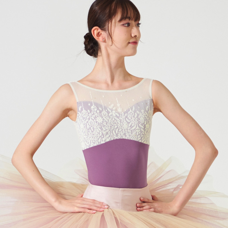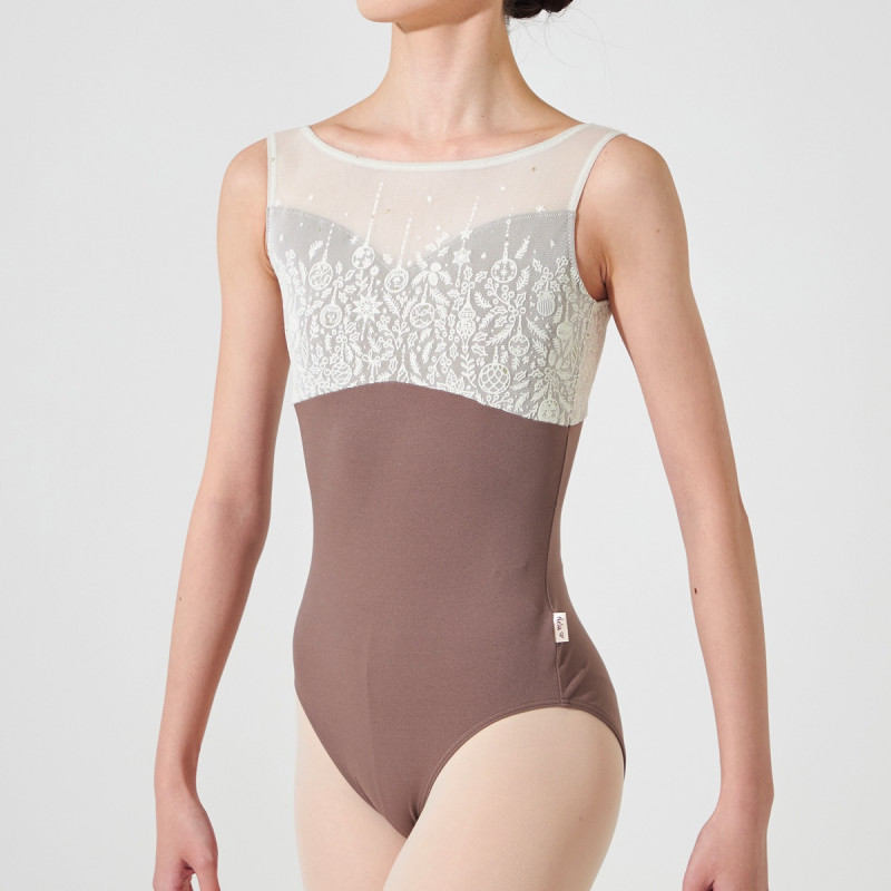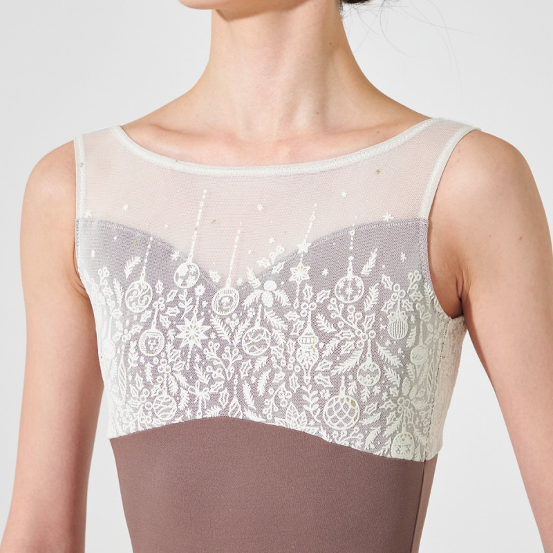 クリスマスオーナメントをモチーフにしたオリジナルフロッキープリントを載せたノースリーブレオタード