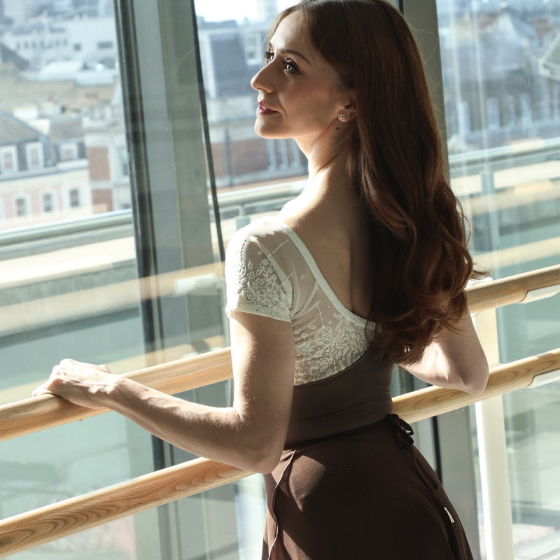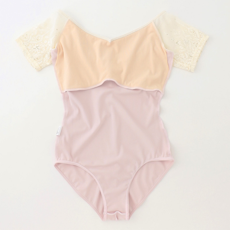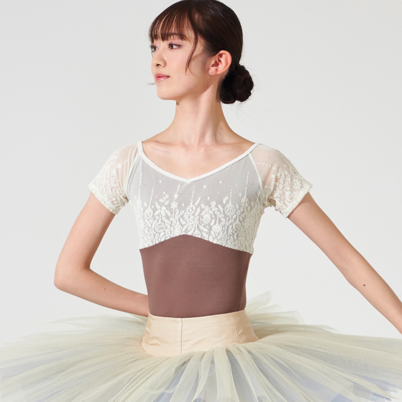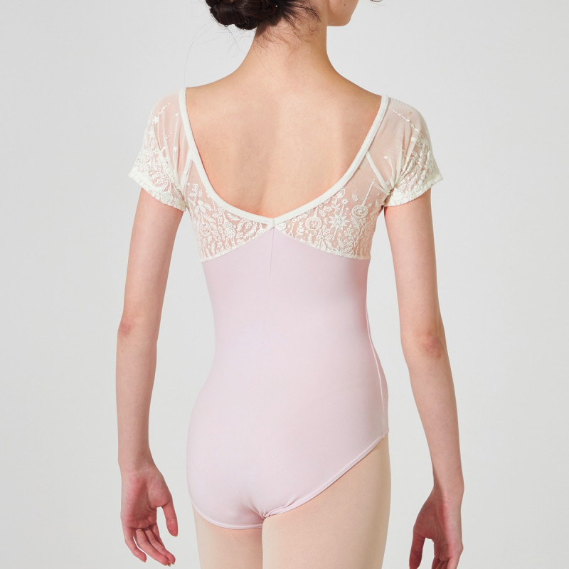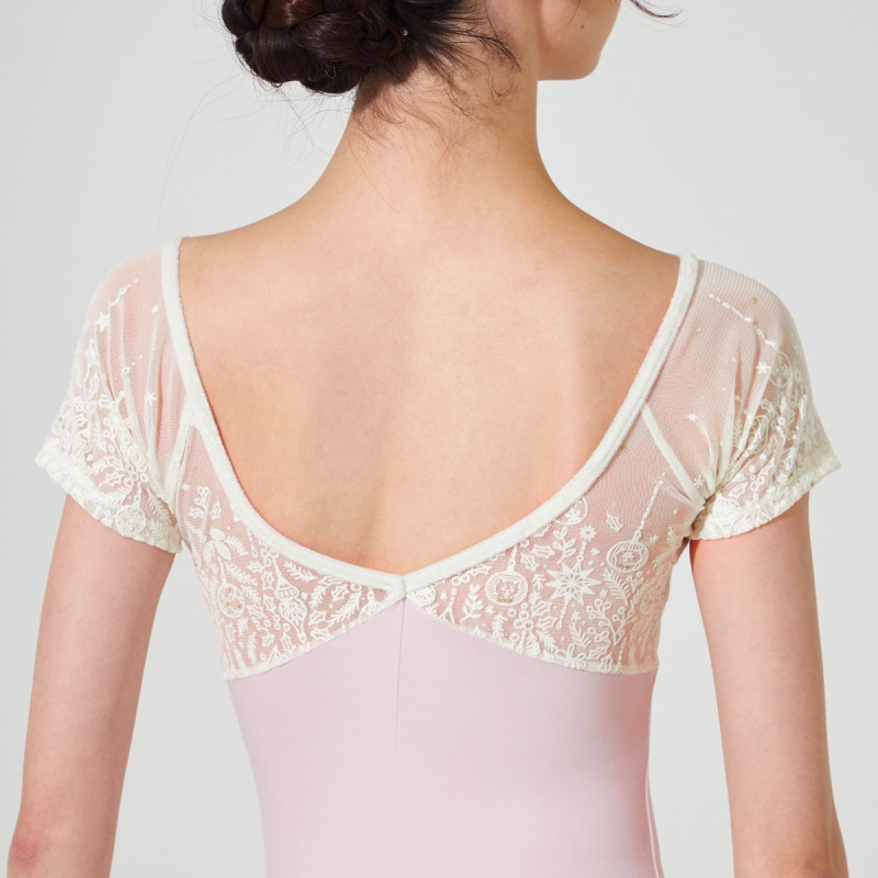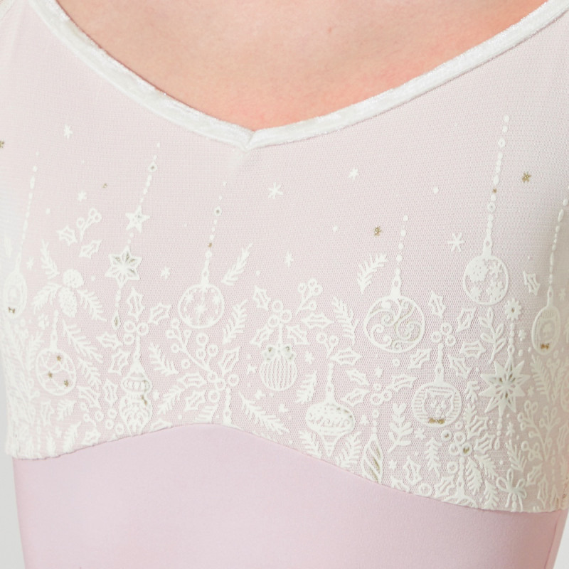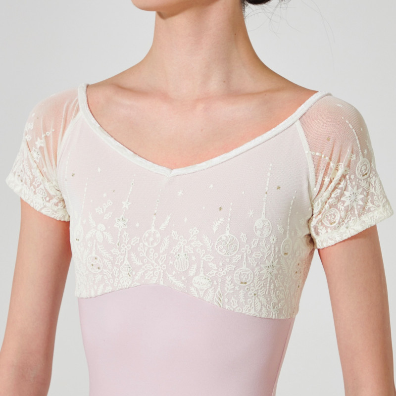 クリスマスオーナメントをモチーフにしたオリジナルフロッキープリントを袖まで贅沢に使ったハーフスリーブレオタード