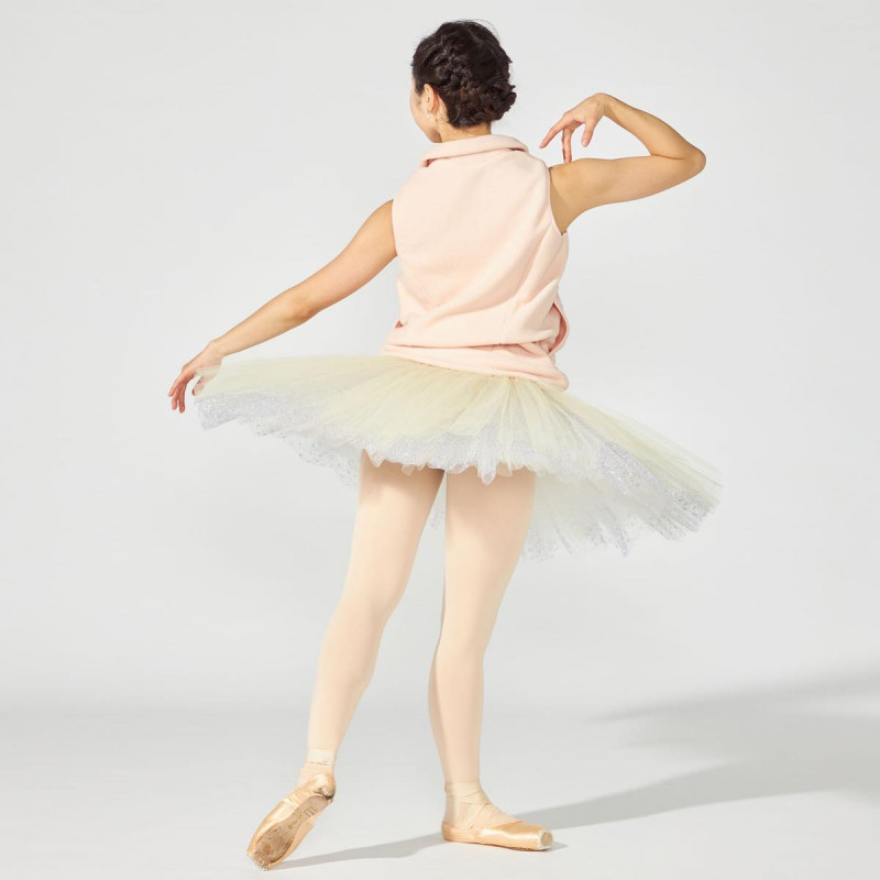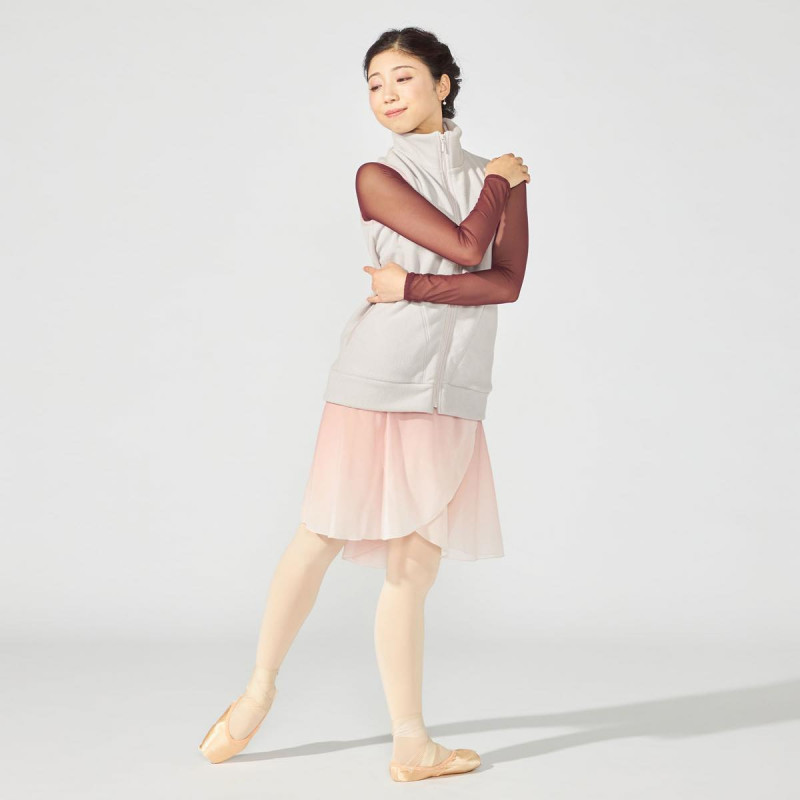 袖がないことで腕を自由に動かせ、レッスン中でも身体が温まるまで快適に着用できる。