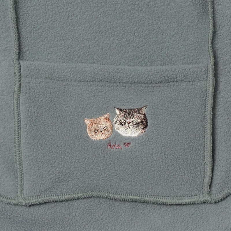 カイロポケット部分の、愛猫をモチーフにした刺しゅうがポイント。