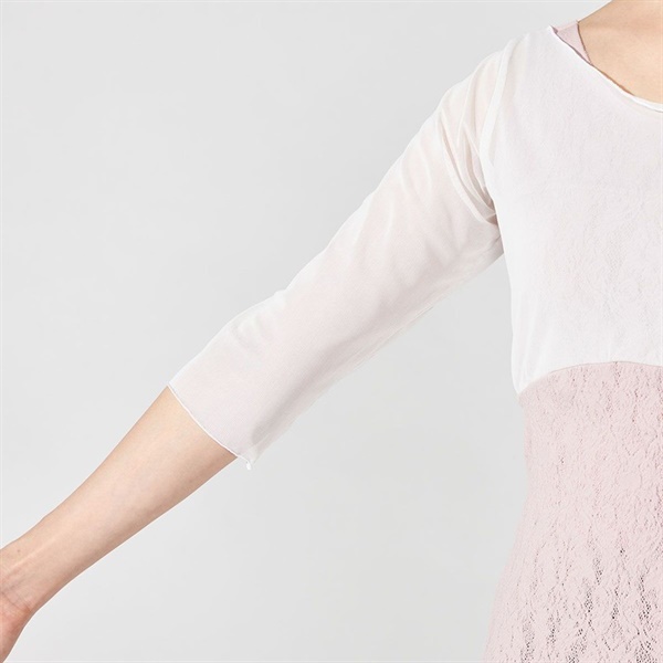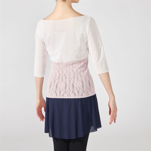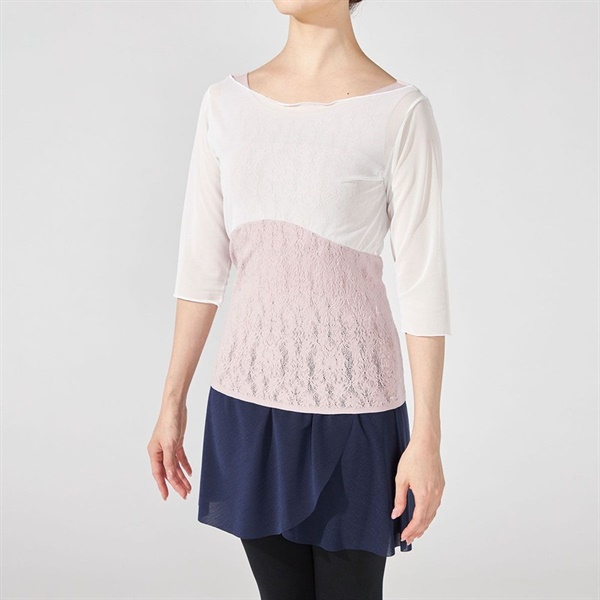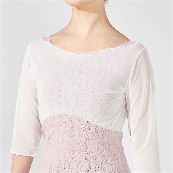 チュールトップと重ね着したようなデザインは上半身の気になる部分を美しくカバー。