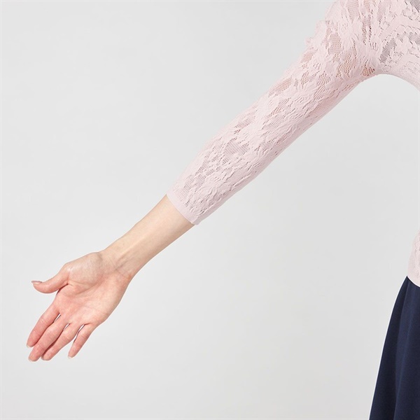 オールシーズン使えるベーシックなデザインのトップは、フラワーモチーフを組み合わせたレース柄で、上品なシアー感がデザインポイント。