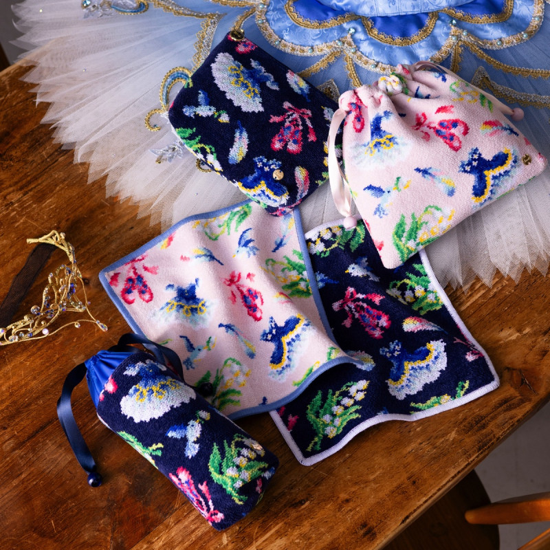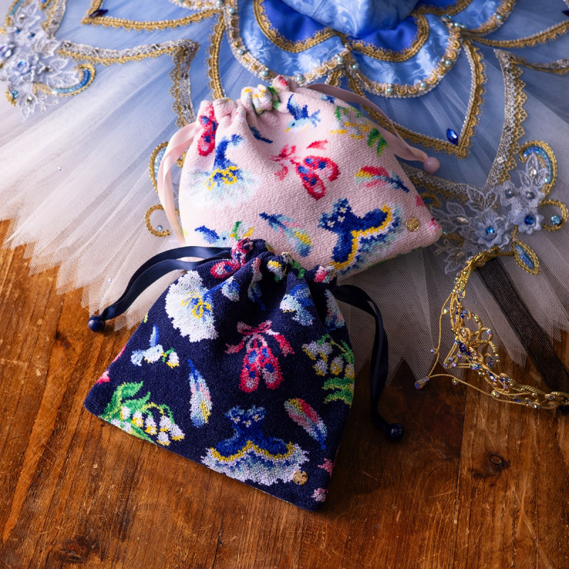毎回ご好評をいただいている巾着が今回もハンカチと同じデザインで登場。ヘア小物やコスメ、バレエグッズなどの小物をたっぷり収納できるサイズ感です。