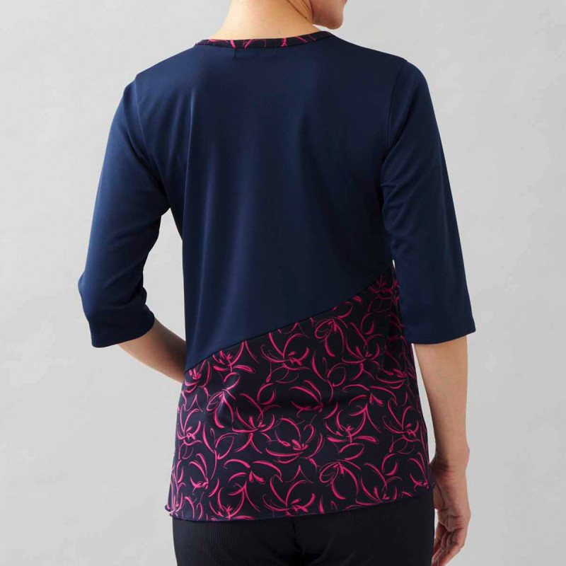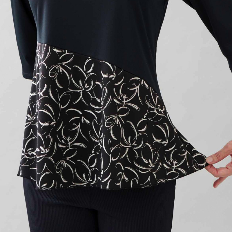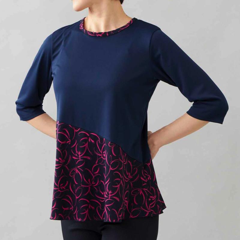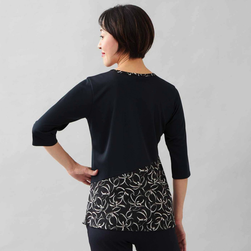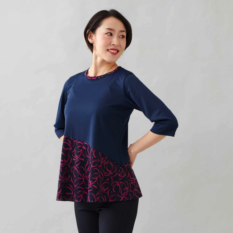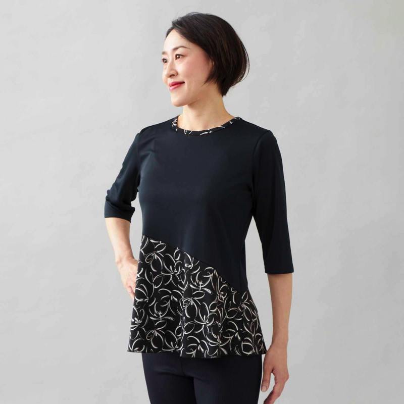無地とプリント柄を組み合わせて、上半身が間延びして見えないようにアシンメトリーな切り替えデザイン。