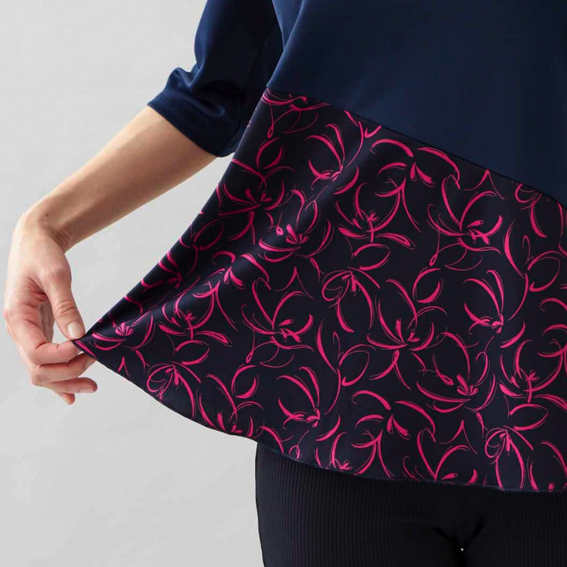 プリント地部分は、適度な伸縮性と程よい肉感ながらドレープ性も美しいスムース素材。