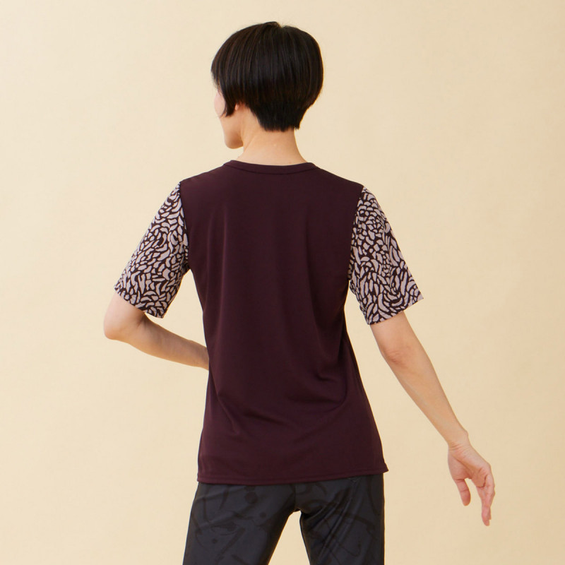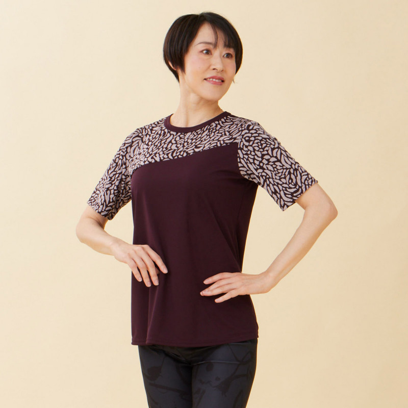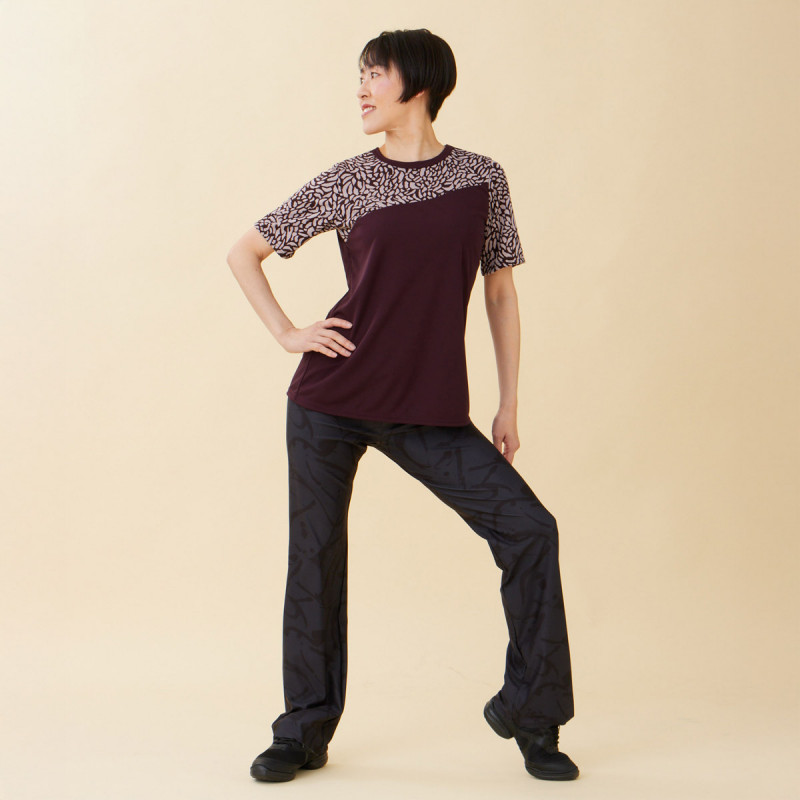 無地とモダンな印象のプリント柄を組み合わせて、上半身が間延びして見えないように斜めアシンメトリーな切り替えを入れたデザイン。