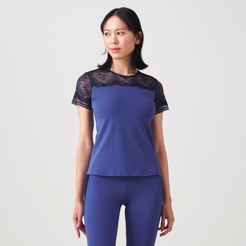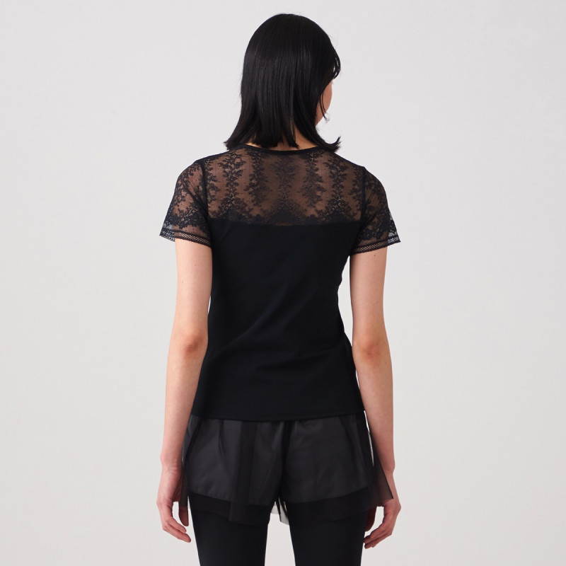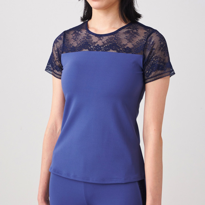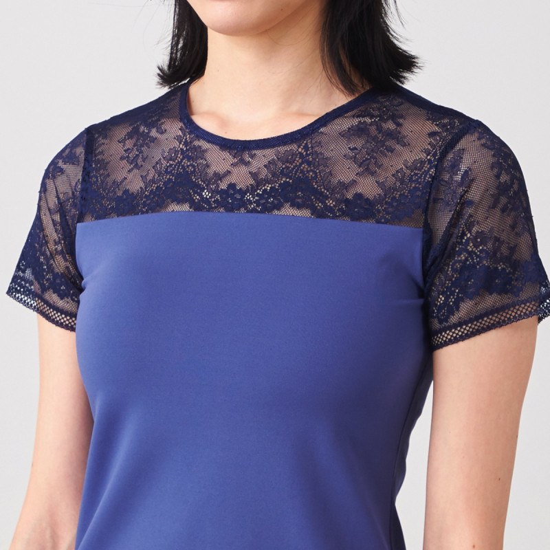 レオタードで人気のスムース素材とストレッチレースを組み合わせたTシャツタイプのトップ。
