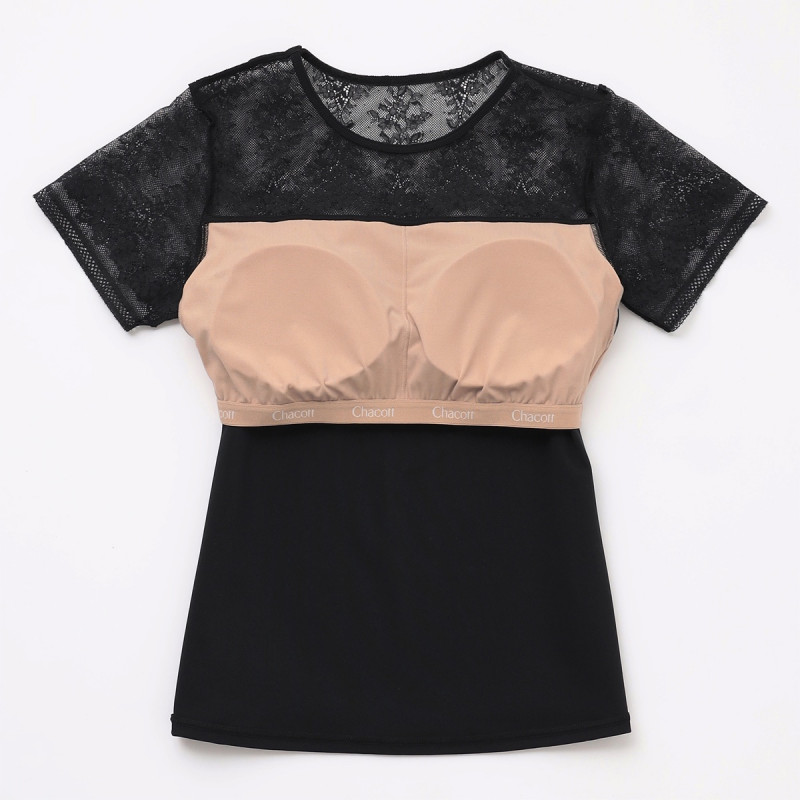 胸元の裏側は吸水速乾、消臭裏地とホールド感を高めたカップが差し込み式で入りで、1枚でも着られる。