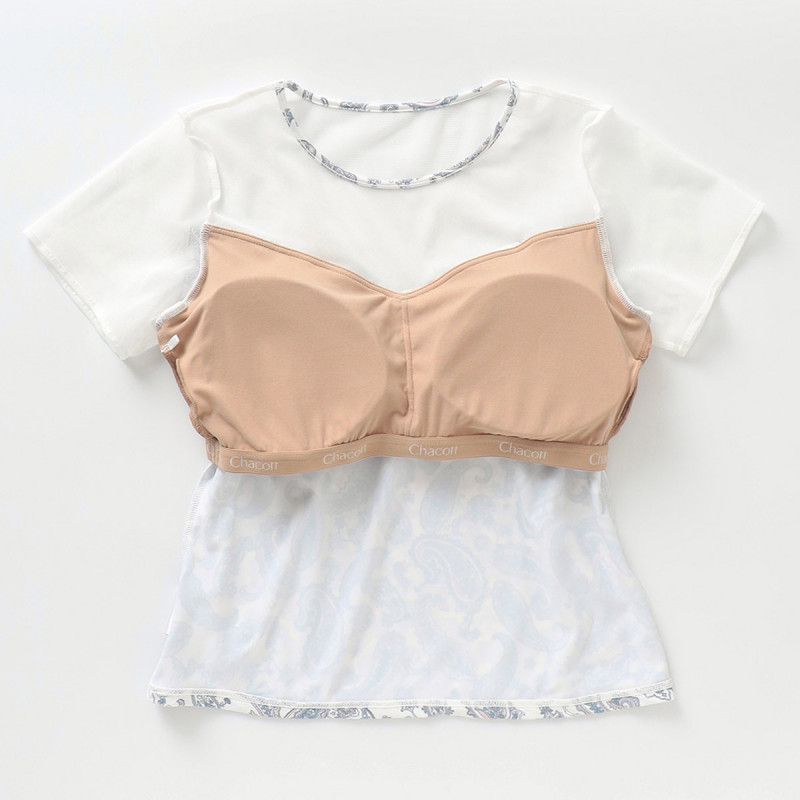 胸カップは抗菌防臭機能素材を使用、差し込み式で下着がなくても1枚で着用可能。