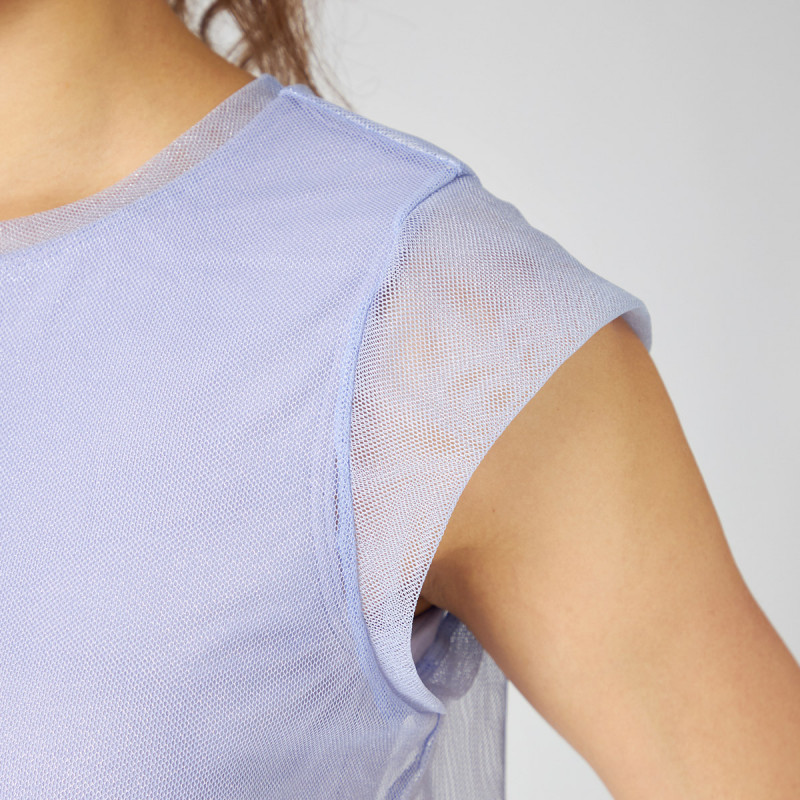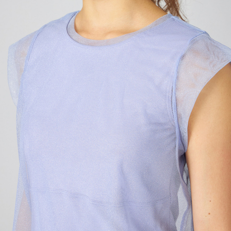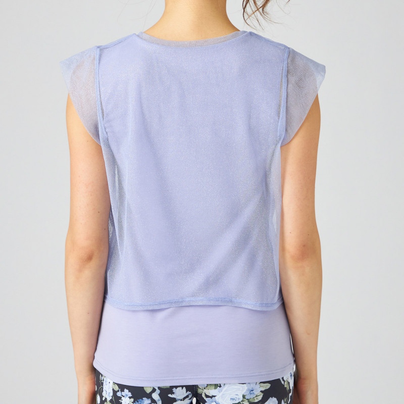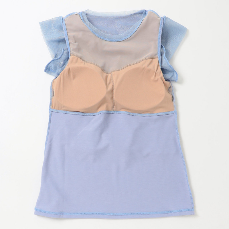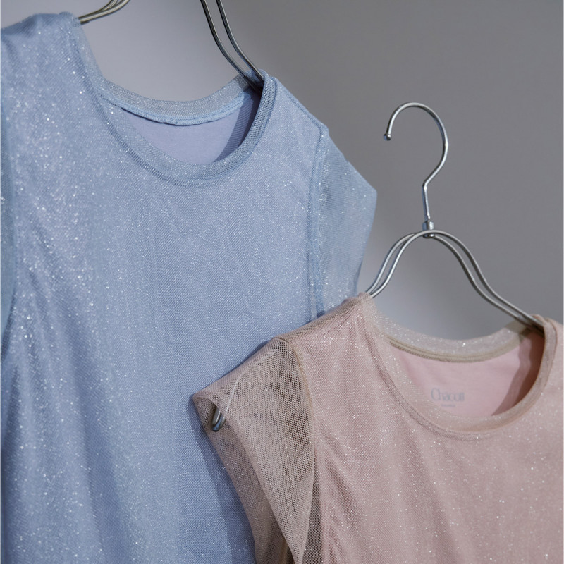 上にレイヤードしたシアーTシャツは、ラメのストレッチチュールを使用しきらきらと華やかな印象に。